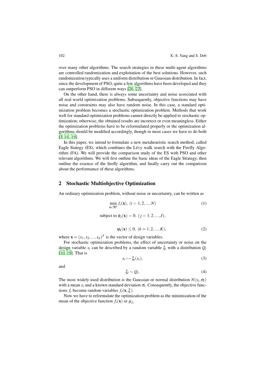 另一方面,总有一些与所有现实世界的优化问题相关的不确定性和噪音。随后,目标函数可能有噪声和约束也可能有随机噪声。在这种情况下,一个标准的优化问题成为一个随机优化问题。标准优化问题的工作方法不能直接应用于随机优化;否则,所获得的结果是不正确的,甚至是没有意义的。不是优化问题必须重新修正,就是优化算法应作相应修改,虽然在大多数情况下,我们必须做两个 [3, 10, 19]。