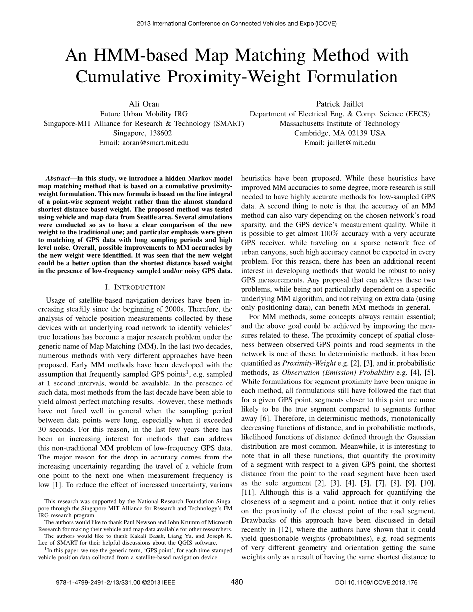 在本研究中,我们引入了一种基于累积邻近权重公式的隐马尔可夫模型映射匹配方法。这个新公式是基于点分段权的线积分,而不是基于最短距离的标准权。利用西雅图地区的车辆和地图数据对该方法进行了测试。为了将新的权重与传统的权重进行清晰的比较,进行了多个仿真,重点对长采样周期、高噪声的GPS数据进行了匹配。总的来说,通过新的重量可以提高地图匹配(MM)的精确度。可以看出,在存在低频采样和/或噪声GPS数据的情况下,新的权重可能比基于最短距离的权重更好。