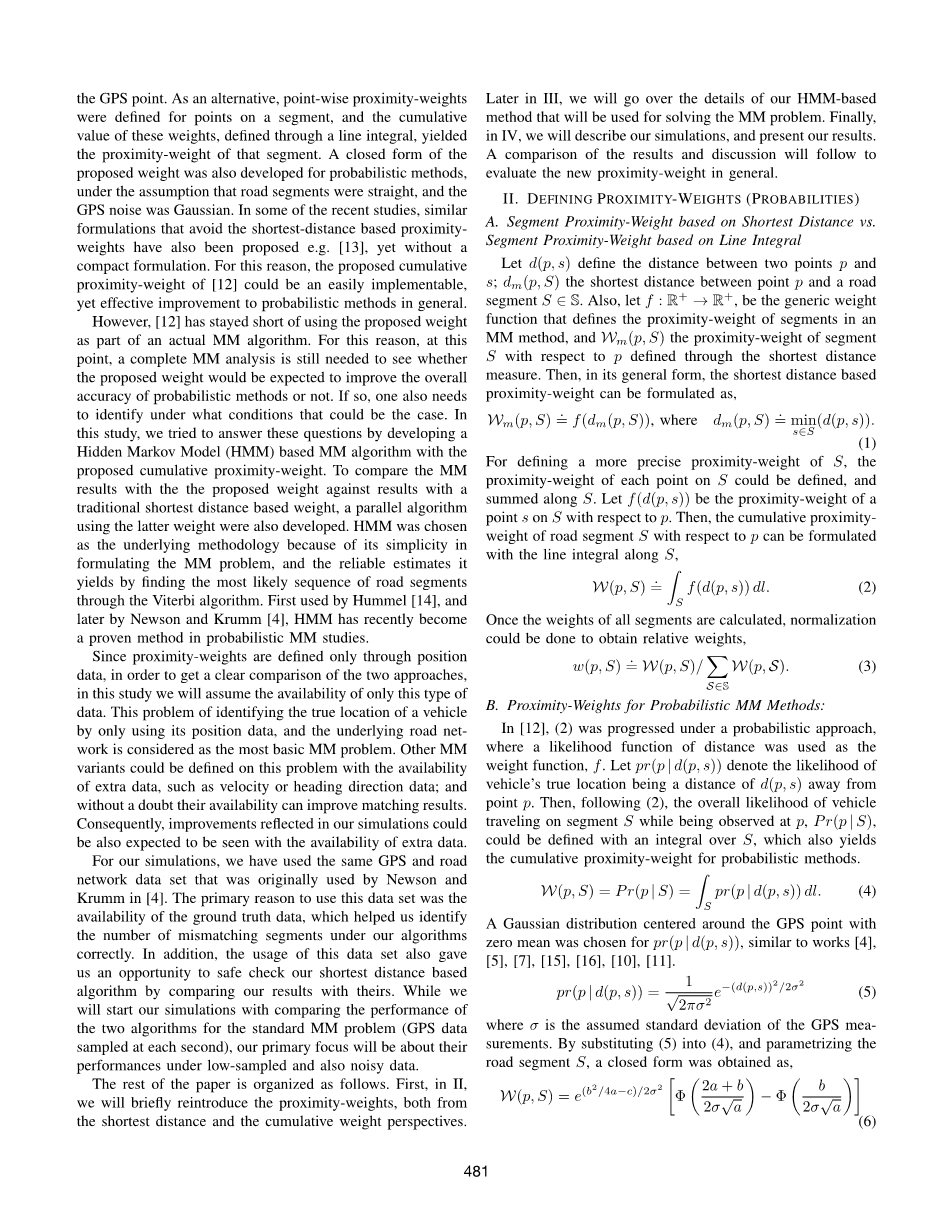 在[12]中,(2)是在概率方法下进行的,其中距离的似然函数用作权重函数,f.让Pr(p |d(p,s))表示车辆实际位置距离点p距离d(p,s)的可能性。然后,根据(2),当在P,P r(P|s)处观测时,车辆在S段上行驶的总可能性可以用S上的积分来定义,该积分也产生概率方法的累积接近权重: