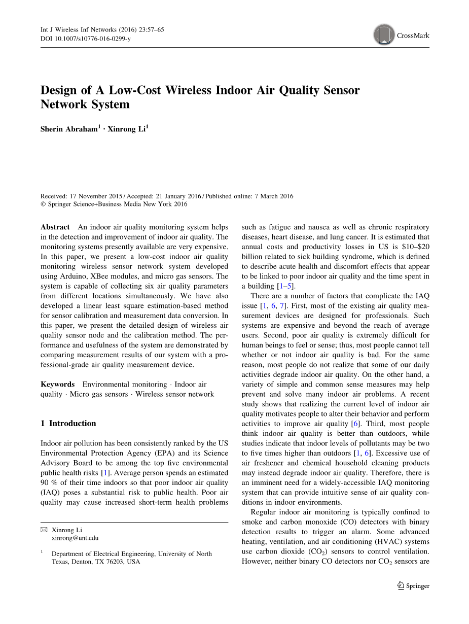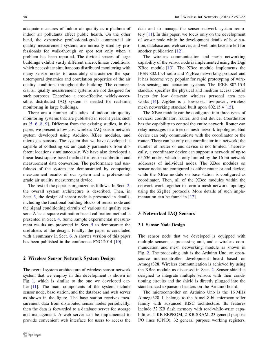 近年来,有一些关于室内空气质量监测系统等的研究被发表出来。不同于现有的研究,在本文中,我们提出了一种基于Arduino XBee模块、微气体传感器开发的低成本的室内空气质量无线传感器网络监控系统。我们开发的这个系统能够从不同的地点同时收集六个空气质量参数。我们还开发了一种基于线性最小二乘法的传感器校准和测量数据转换方法。通过比较我们的系统和professionalgrade空气质量检测装置的测量结果,验证了该系统的性能和实用性。