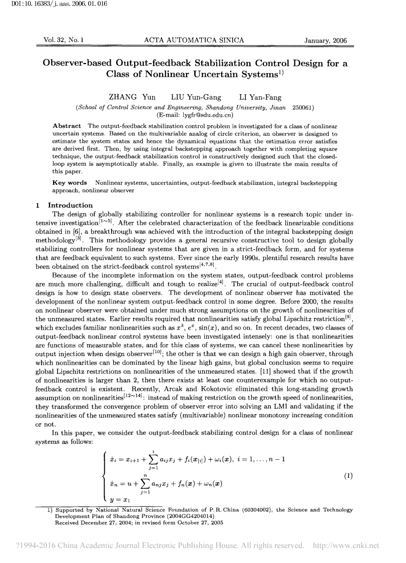 一类非线性不确定性系统基于状态观测器的输出反馈镇定控制设计外文翻译资料