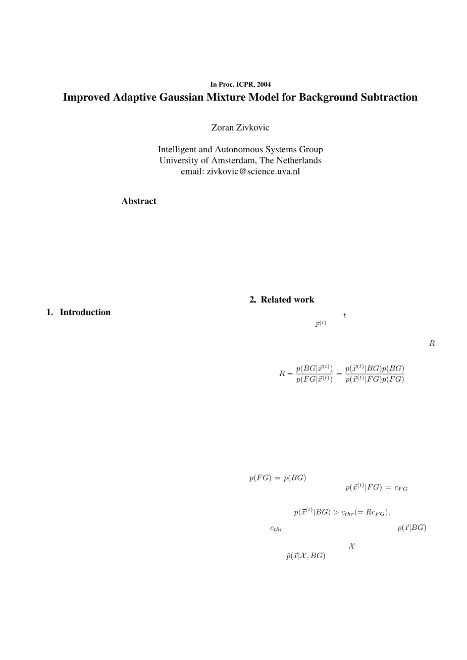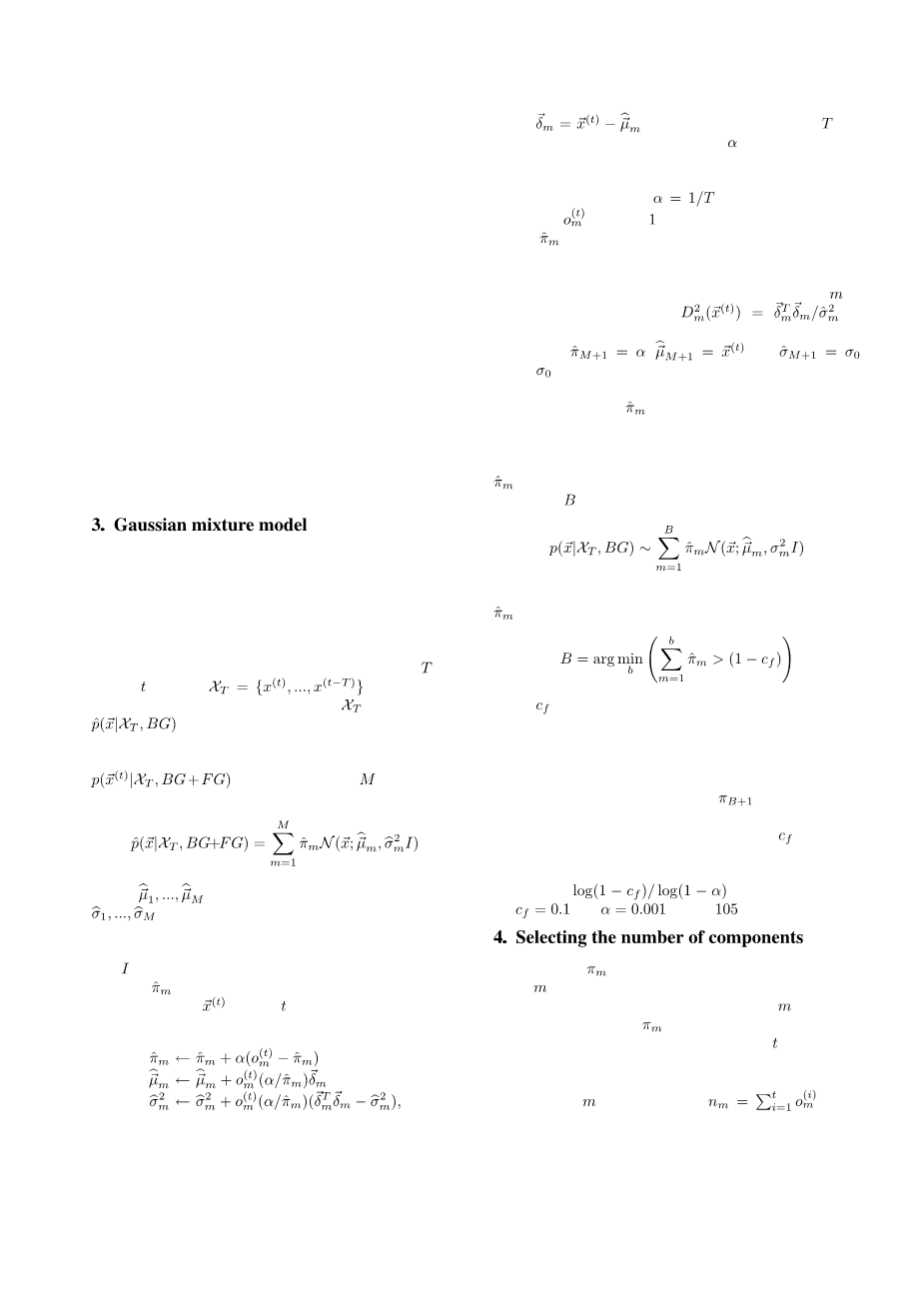 在cthr是阈值。我们将P(~ X | BG)作为背景模型。背景模型估计从训练集表示为x。估计的模型是由circ;P表示(~ X | X,BG)和依赖于训练集表示明确。我们假设样本是独立的,主要的问题是如何有效地fi估计密度函数和适应可能的变化。内核为基础的密度估计中使用[ 4 ],我们在座的改进GMM从[ 3 ]。在文献中,有模型考虑的图像序列的时间方面,决定也取决于以前的像素值从序列。例如,在[ 5,11 ]的像素值分布随着时间的推移被建模为自回归过程。在[ 6 ] Hidden Markov模型使用。然而,这些方法通常是慢得多,适应场景的变化是困难的。