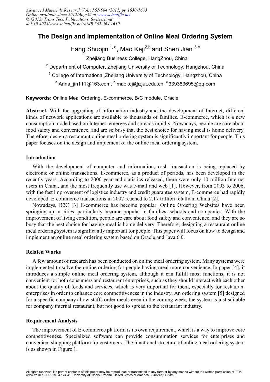 [4] XU Honejun,基于网络的在线餐订单系统的设计与实现[ J ],计算机应用与软件,2009, 26(5), 151-153.