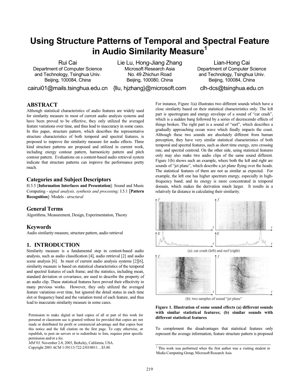 虽然音频特征的统计特性得到广泛的应用,在大多数当前音频分析系统中进行相似性测量已被证明是有效的,但他们只利用了平均值。随着时间的推移发生变化,从而导致某些情况下的不准确。在本文中,结构模式,其中描述了代表是时间和光谱特征的结构特征提出改善音频效果的相似性度量。在现有工作中提出和利用了三种结构模式,包括能量轮廓模式,谐波模式和音调轮廓图案。 基于内容的音频检索系统的评估表明结构模式可以提高性能许多。