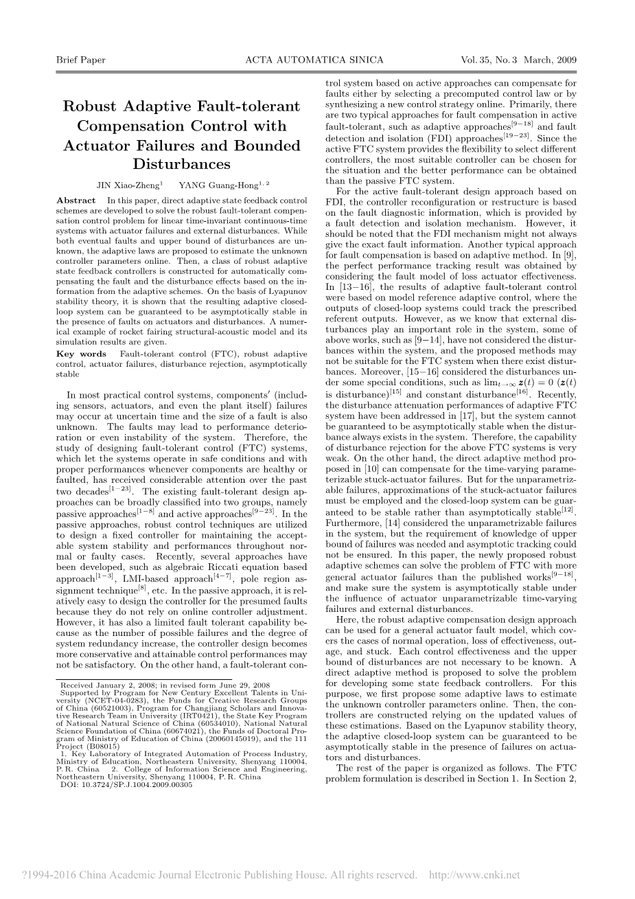 关键词:容错控制(FTC) 鲁棒自适应控 执行器故障 扰动抑制 渐近稳定