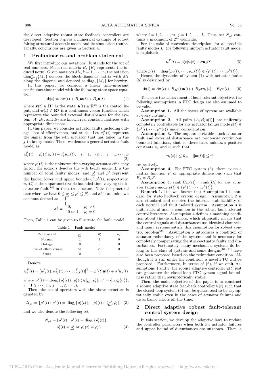 对于基于FDI的主动容错设计方法,控制器的重新配置或重组基于故障诊断信息,这个信息由故障检测和隔离机制提供。 但是,应该指出,FDI可能并不总是提供确切的故障信息。 另一种典型的故障补偿方法是基于自适应方法。 在文献[9]中,考虑执行器失效的故障模型时来得完美的性能跟踪结果。 在[13-16]中,自适应容错控制的结果基于模型参考自适应控制,其中闭环系统的输出可以跟踪规定的参考输出。 但是,正如我们所知道的,外部干扰在系统中起着重要的作用,而上述的一些工作如[9-14]没有考虑系统内的干扰,因此所提出的方法可能并不适用于FTC系统存在干扰的情况。 此外,[15-16]考虑了一些特殊条件下的扰动,如 (是干扰)[15]和恒定干扰[16]。 最近,自适应FTC系统的干扰衰减性能已在[17]中得到解决,但不能保证当系统中总是存在干扰时,它是渐近稳定的。 因此,上述FTC系统的抗干扰能力非常弱。 另一方面,文献[10]中提出的直接自适应方法可以补偿时变的参数化的执行器故障。但是对于无法参数化的故障,必须采用近似的方法,使闭环系统保持稳定,而不是渐近稳定[12]。,此外,文献[14]还考虑了不可参数化的故障,但需要知道故障上限,并且不能保证渐近跟踪。 在本文中,比起已发表的成果[9minus;18],新提出的鲁棒自适应方案可以更好地解决一般执行器故障的FTC的问题,并确保系统在执行器无参数化时变故障和外部干扰的影响下渐近稳定。