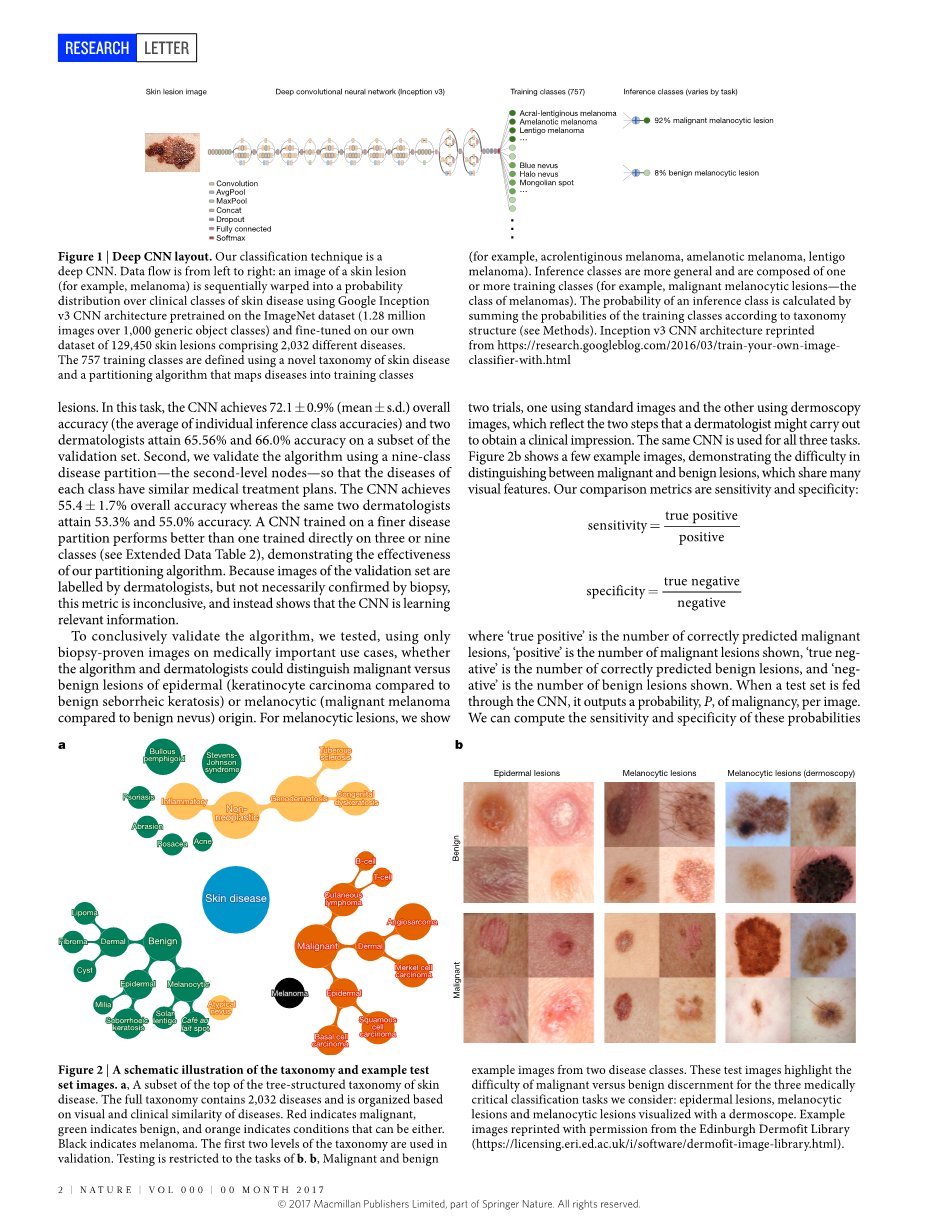 通过专用仪器采集皮肤镜图像,并通过侵入性活检和显微镜获取组织学图像;由此两种模式产生高度标准化的图像。 摄影图像(例如智能手机图像)在变焦,角度和照明等因素中表现出可变性,使分类更具挑战性。我们通过使用数据驱动的方法克服了这一挑战---141万个预训练和训练图像使分类对照片变化稳健。许多先前的技术需要在分类之前进行大量的预处理,损伤分割和特定领域视觉特征的提取。相比之下,我们的系统不需要手工制作的特征; 它直接从图像标签和原始像素进行端对端培训,一种网络可以同时用于摄影和皮肤镜像。现有的工作使用小型数据集,通常少于一千个皮肤病灶图像,因此对新图像没有很好的概括。我们用一种新的皮肤科医生标记的129,450张临床图像数据集(包括3,374张皮肤镜图像)来证明可归纳的分类。深度学习算法在计算和超大型数据集方面取得突破,最近已被证明超过人类在视觉任务中的表现,如玩Atari游戏,战略棋盘游戏如Go和物体识别。在本文中,我们概述了与三项关键诊断任务中的皮肤科医师表现相匹配的CNN的发展:黑素瘤分类,使用皮肤镜检查的黑素瘤分类和癌分类。 我们将比较限制为基于图像的分类。