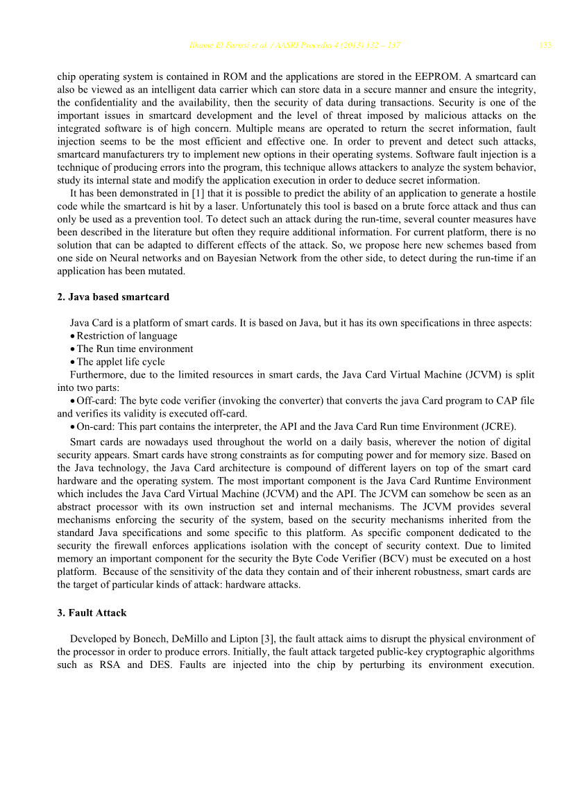当今世界各地每天都在使用智能卡,所以出现数字安全的概念出现了。智能卡具有很强的计算能力和内存大小限制。基于Java技术,Java卡架构复合不同层上的智能卡硬件和操作系统。最重要的组成部分是Java卡运行时环境,其包括Java卡虚拟机(JCVM)和API。该JCVM能以某种方式被看作是一个与自己的指令集和内部机制的抽象处理器。所述JCVM在用几种机制保证该系统的安全性的基础上,继承了标准的Java规范和某些特定于该平台的安全机制。作为专用于安全防火墙的特定组件,强制应用程序隔离安全背景。由于内存有限,为安全的重要组成部分字节码验证器(BCV)必须在主机平台上执行。因为它们含有其固有的鲁棒性和数据的敏感性,智能卡是硬件攻击的特定目标。