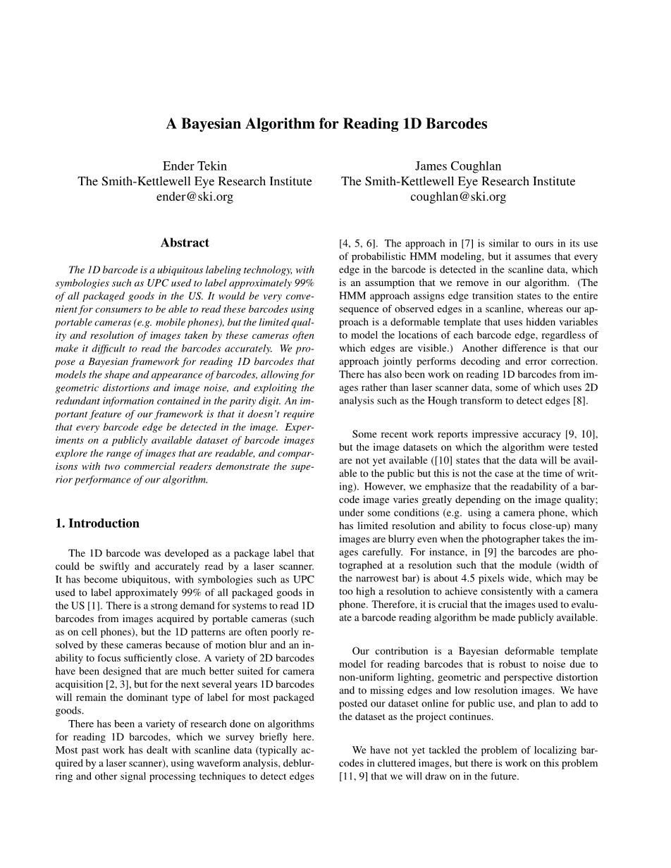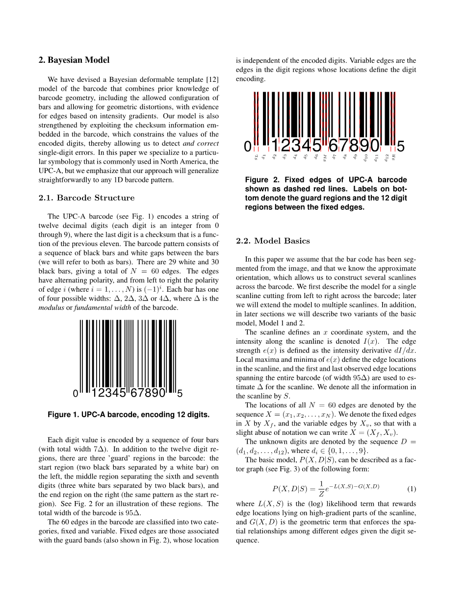 我们设计了一个贝叶斯变形模板[12]结合先前知识的条形码模型条形码几何,包括允许的配置有条件并允许几何扭曲,有证据基于强度梯度的边缘。我们的模型也是通过利用嵌入的校验和信息来加强条形码,这限制了编码数字,从而允许我们检测和纠正错误。在本文中,我们专注于一个特定的北美常用的符号系统UPC-A,但需要强调的是我们的方法将泛化直接向任何一维条形码图案。