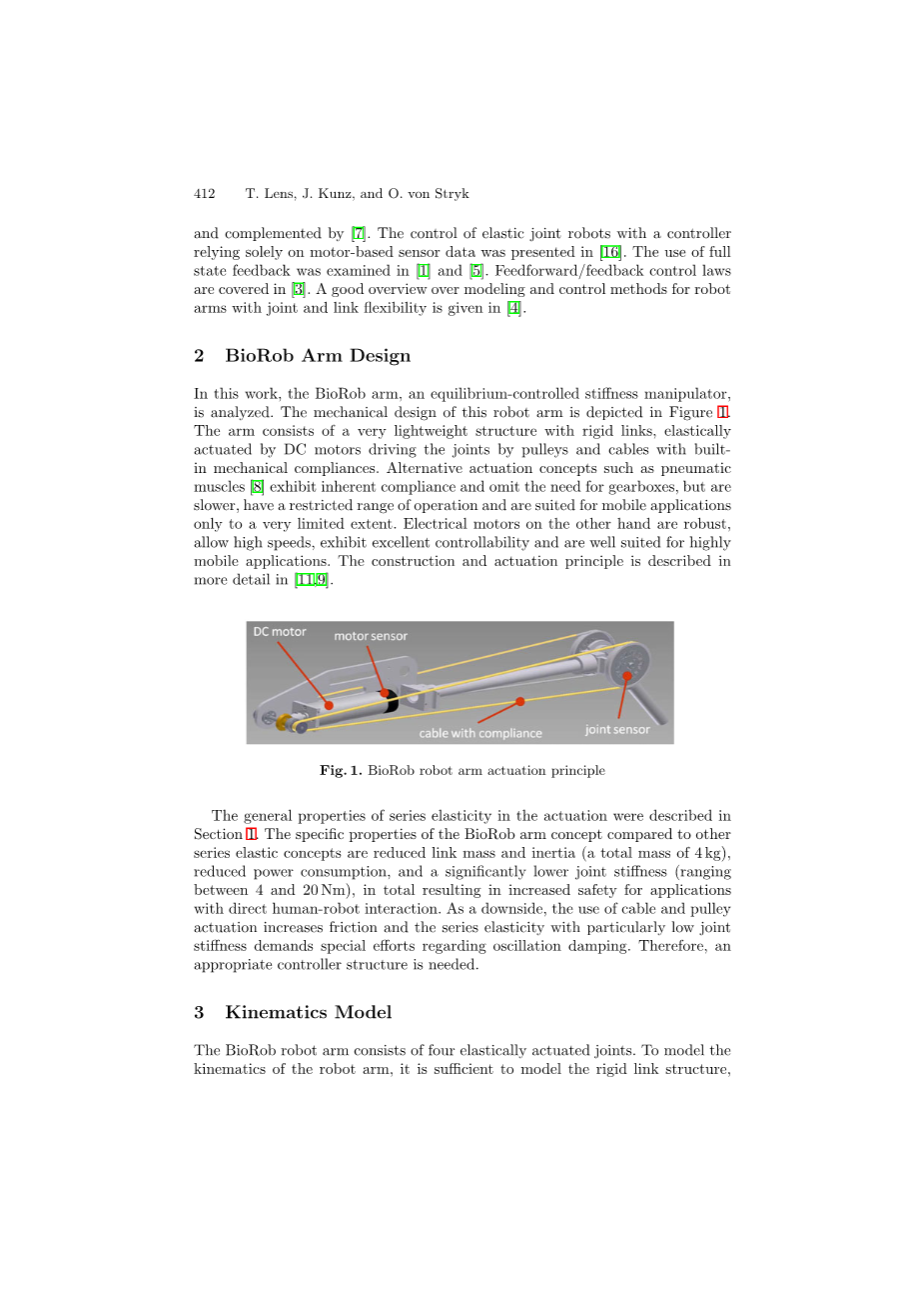 在这项工作中,我们分析了一种平衡控制的刚性仿生机器臂。该机械臂的机械设计如图1所示。该臂包括一个非常轻的结构与刚性连接,弹性驱动有直流电机驱动,关节由滑轮和内置机械顺从的电缆驱动。诸如气动肌肉(8)这样的替代驱动概念表现出了固有的一致性,省略了齿轮箱的需求,但是速度比较慢,操作范围有限,并且只适用于非常有限的移动应用。另一方面,电动机是强劲的,允许高速运作,表现出了优良的可控性,很适合高度移动应用。(11,9)更详细地描述了结构和驱动的原理。
