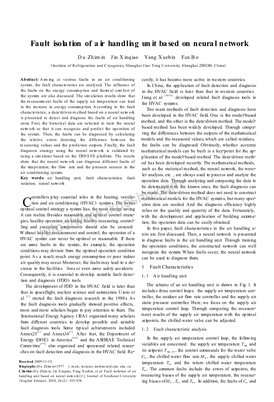 译文标题 基于神经网络的空调箱故障诊断