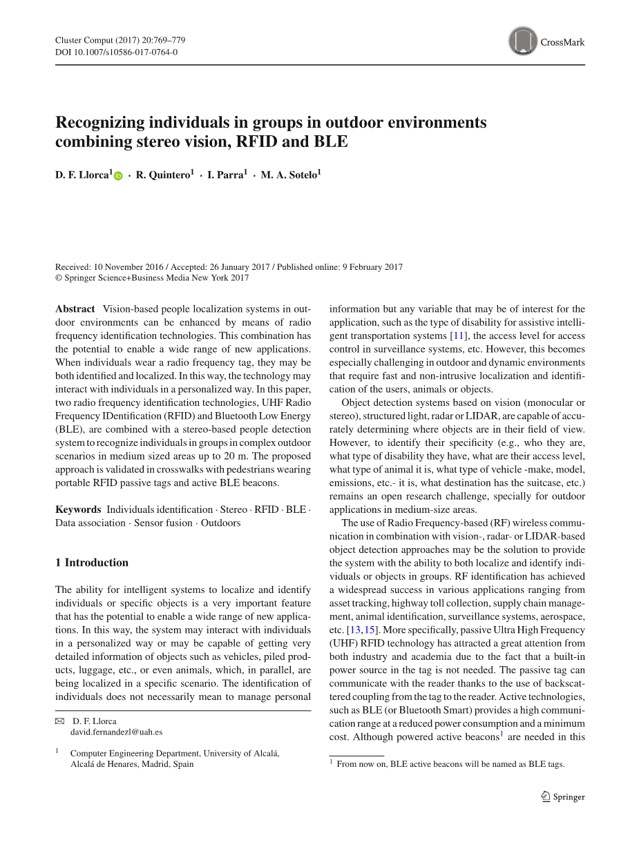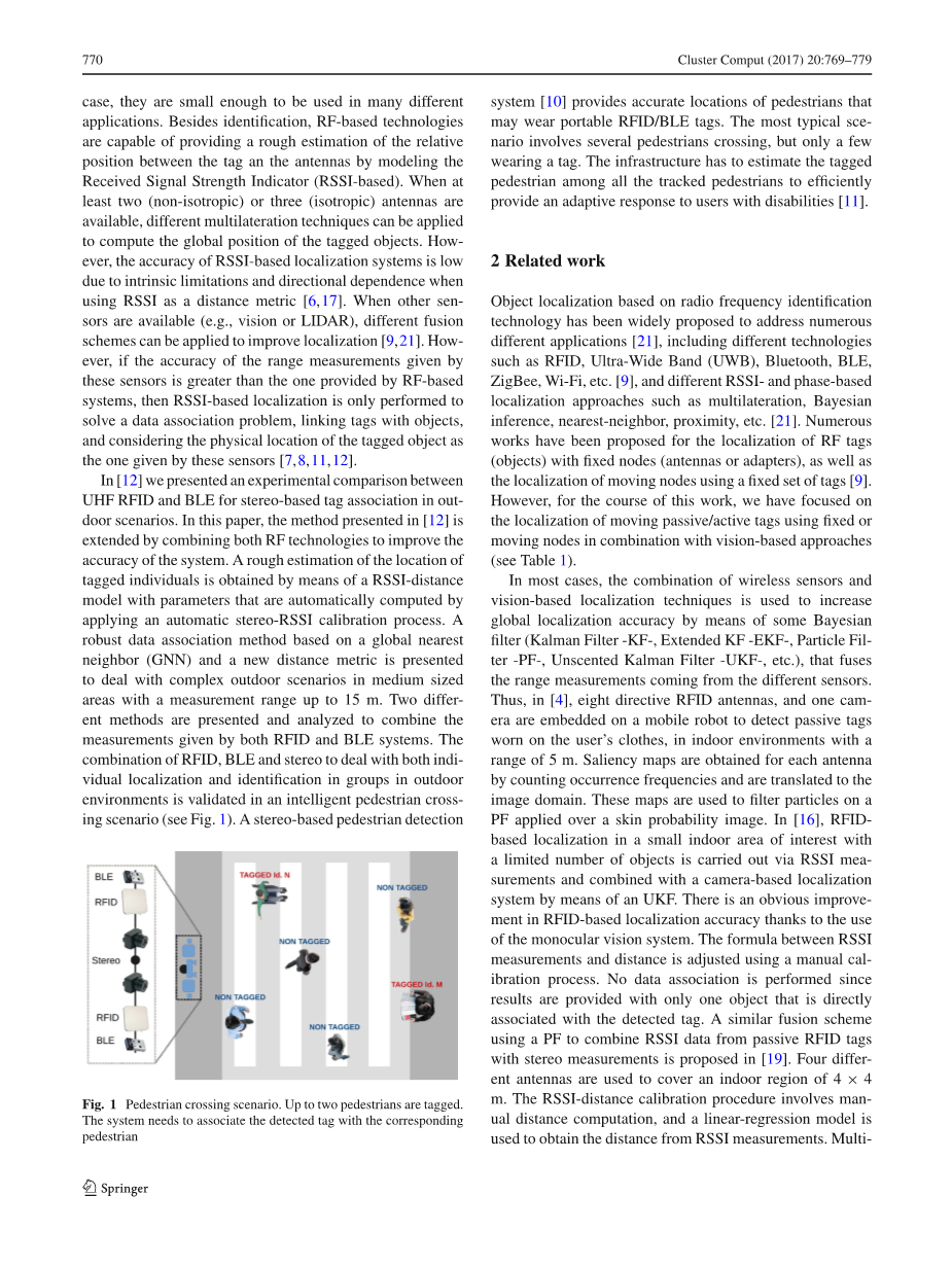 将基于射频的(RF)无线通信与基于视觉,雷达或LIDAR的对象检测方法结合使用可以是为系统提供定位和识别组中的个体或对象的能力的解决方案。射频识别在各种应用中取得了广泛的成功,包括资产跟踪, 高速公路收费,供应链管理,动物识别,监控系统, 航空航天等。13,15].更具体地说,无源超高频(UHF) RFID技术由于不需要标签中的内置电源而引起了业界和学术界的极大关注。由于使用从标签到阅读器的反向散射耦合,无源标签可以与阅读器通信。诸如BLE(或蓝牙智能)之类的有源技术以降低的功耗和最低成本提供高通信范围。虽然有动力的活动信标1 在这需要它们很小,可以用在许多不同的应用中。除了识别之外, 基于RF的技术能够通过对接收信号强度指示器(基于RSSI的)建模来粗略估计标签与天线之间的相 对位置。当至少两个(非各向同性)或三个(各向同性)天线可用时,可以应用不同的多点定位技术来计算标记对象的全局位置。然而,当使用RSSI作为距离 度量时,由于内在限制和方向依赖性,基于RSSI的定 位系统的准确性较低[6,17].当其他传感器可用时(例 如,视觉或激光雷达),可以应用不同的融合方案来 改善定位[9,21].但是,如果这些传感器给出的距离测 量精度大于基于RF的系统提供的距离,则只执行基于RSSI的定位以解决数据关联问题,将标签与对象链接, 并考虑物理位置标记对象的标记为这些传感器给出的 对象[7,8,11,12].在[12我们提出了UHF RFID和BLE之间的实验比较, 用于室外场景中基于立体声的标签关联。在本文中, 方法[12通过结合两种RF技术来扩展,以提高系统的准 确性。通过RSSI-距离模型获得对标记个体的位置的粗 略估计,该RSSI-距离模型具有通过应用自动立体声RSSI校准过程自动计算的参数。提出了一种基于全局 最近邻居(GNN)和新距离度量的鲁棒数据关联方法,以处理中等大小区域中复杂的室外场景,测量范围可达15米。提出并分析了两种不同的方法,以结合RFID 和BLE系统给出的测量结果。RFID,BLE和立体声相结 合,可以在室外环境中分组处理个人定位和识别,并 在智能人行横道场景中得到验证(见图2)。1).基于 立体声的行人检测系统[10]提供可能佩戴便携式RFID / BLE标签的行人的准确位置。最典型的情况是几个行人穿越,但只有少数人穿着标签。基础设施必须估计所有被跟踪行人中被标记的行人,以便有效地为残疾用户提供适应性响应[11].