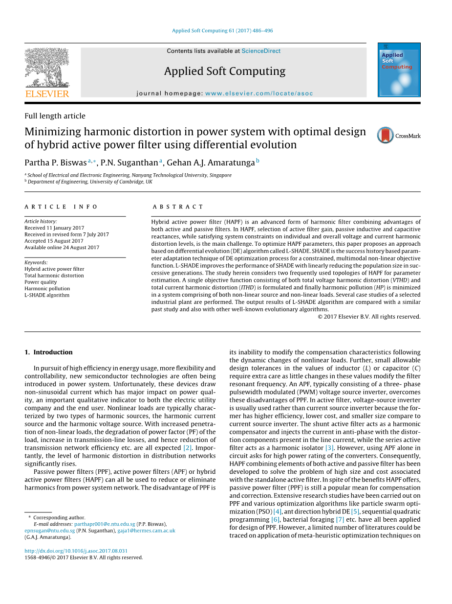 关键词:混合有源电力滤波器;总谐波失真;电能质量;谐波污染;L-SHADE算法