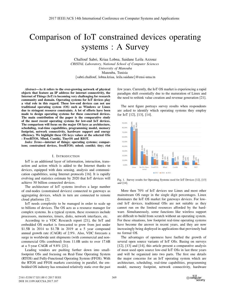 摘要——物联网(IoT)是指以IP地址为特征的不断增长的物理对象网络,物联网正成为研究界和研究领域的一大挑战。物联网设备的操作系统在这方面起着至关重要的作用。由于资源的限制,这些低端设备无法使用Windows或Linux等传统操作系统。为了设计这些相关设备的操作系统,已经做了大量的工作。本文的主要贡献是对最新的低端物联网设备操作系统的比较研究。比较的重点是架构、调度、实时功能、编程模型、内存占用、网络连接、硬件支持和能源效率等主要操作系统关键。我们在选定的OSs中突出显示这些OS关键值:FreeRTOS、Mbed、Contiki、TinyOS和RIOT。