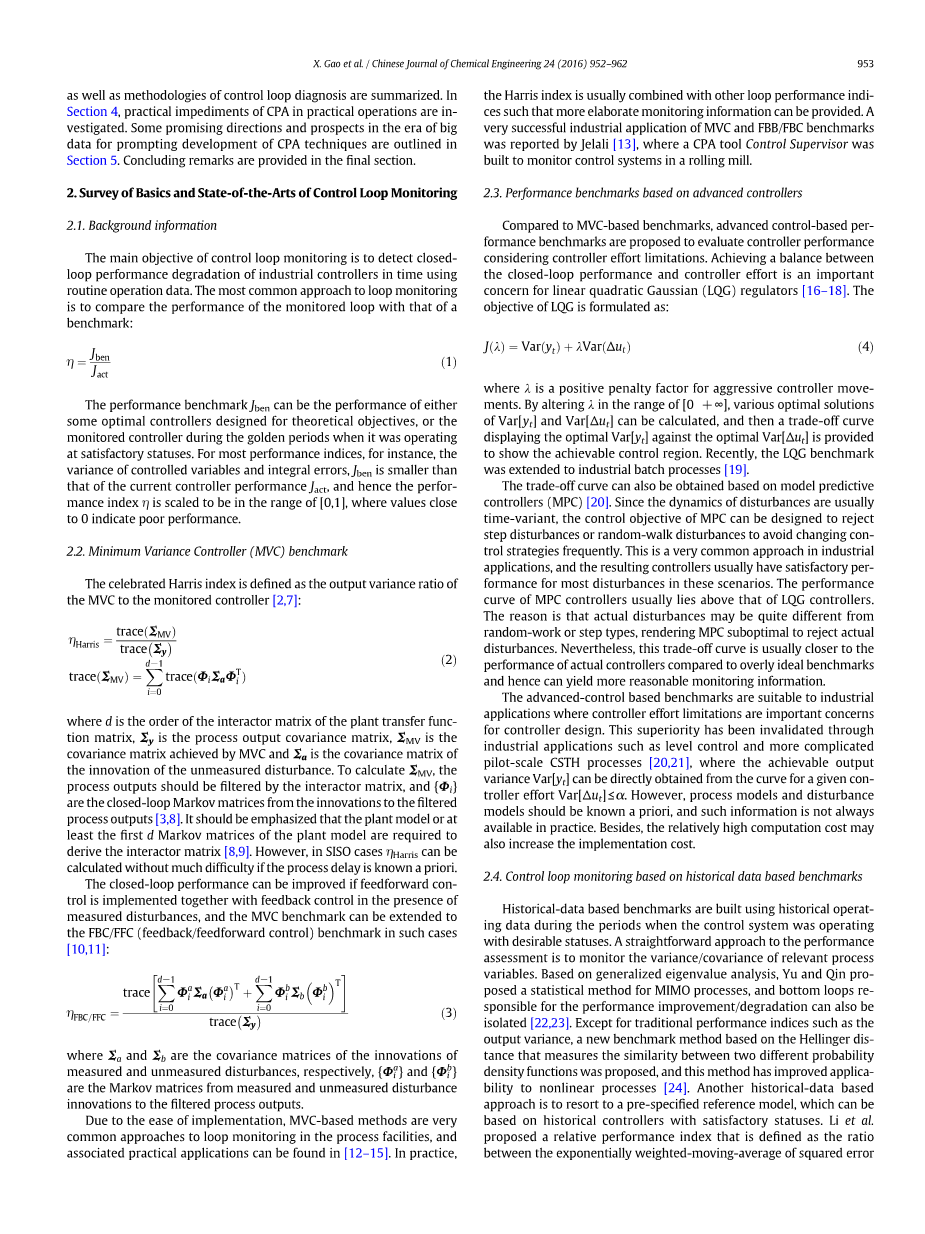 在本文中,将会对控制器性能监测及诊断领域中的基础知识及最新进展进行全面回顾。尽管已经有很多文章对此进行了详细的总结,但是本文进一步的对这些总结进行了完善,尤其是控制器的诊断,包括了控制器故障、外部干扰和阀门故障。此外,还讨论了一些阻碍控制器性能评估技术广泛应用的实际困难。因此,综合的专业知识和控制器性能评估技术的实际工业运用需求是十分迫切的。在文章最后,一些关于控制器性能监测和维护潜在的新方向和观点同样被陈现。本文的其余部分按如下方式组织,第二节回顾了控制器性能监测及诊断领域中的基础知识。第三节总结了控制器性能下降的主要原因和控制回路的诊断方法。第四节中调查了一些阻碍控制器性能评估广泛应用的实际困难。第五章则罗列出了一下有前景的方向和大数据背景下提高控制器性能评估技术性能的方法。最后一节则对一些要点进行了总结。