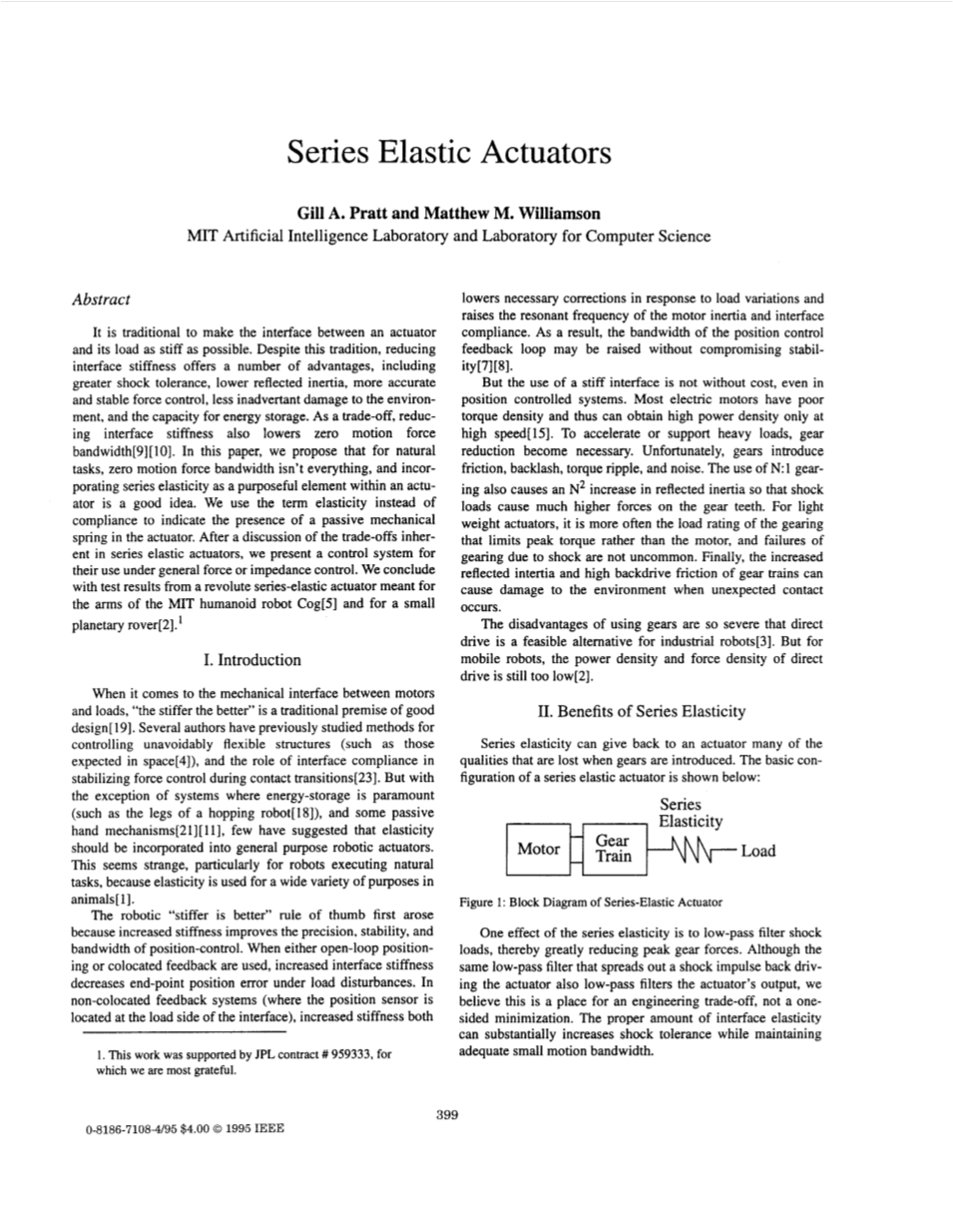 传统的做法是使作动器和其负载之间的界面尽可能地坚硬。尽管如此,降低界面刚度仍具有许多优点,包括更高的抗冲击性,更低的反射惯性,更精确和稳定的力控制,更少的环境破坏以及储能能力。作为权衡,降低界面刚度也会降低零运动力带宽[9][10]。在本文中,我们提出,对于自然任务,零运动力带宽并非一切,将系列弹性/串联弹性/并联弹性作为目的性元件/成分与驱动器/执行机构结合是一个好主意。我们使用术语弹性而不是顺应性来表示执行器中存在被动机械弹簧。在讨论了系列弹性执行器中存在的权衡之后,我们提出了一种在一般力或阻抗控制下使用的控制系统。我们用一个坚固的系列弹性作动器的测试结果得出结论,该作动器用于麻省理工学院人形机器人Cog [5]和小型行星探测器[2]的手臂。