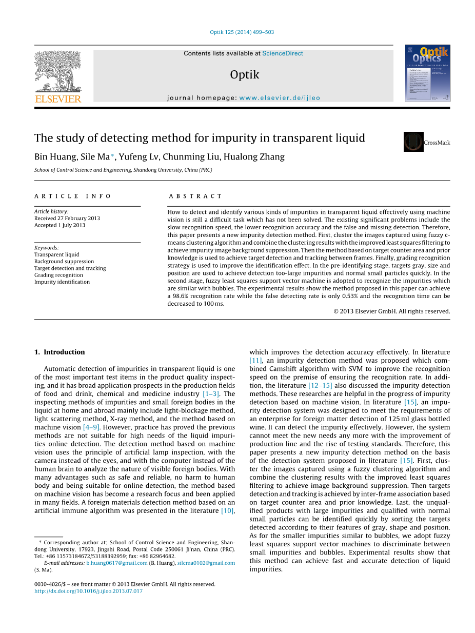 如何利用机器视觉有效地检测和识别透明液体中的各种杂质,仍然是一个尚未解决的难题。目前存在的主要问题包括识别速度慢、识别精度低、漏检漏检等。因此,本文提出了一种新的杂质检测方法。首先,利用模糊c均值聚类算法对采集到的图像进行聚类,将聚类结果与改进的最小二乘滤波相结合,实现对杂质图像的背景抑制。然后采用基于目标计数器面积和先验知识的方法实现帧间目标检测和跟踪。最后,采用分级识别策略提高识别效果。在预识别阶段,利用目标灰度、大小和位置来快速检测太大的杂质和正常的小颗粒。第二阶段采用模糊最小二乘支持向量机对与气泡相似的杂质进行识别。实验结果表明,该方法的识别率可达98.6%,而误检率仅为0.53%,识别时间可缩短至100毫秒。