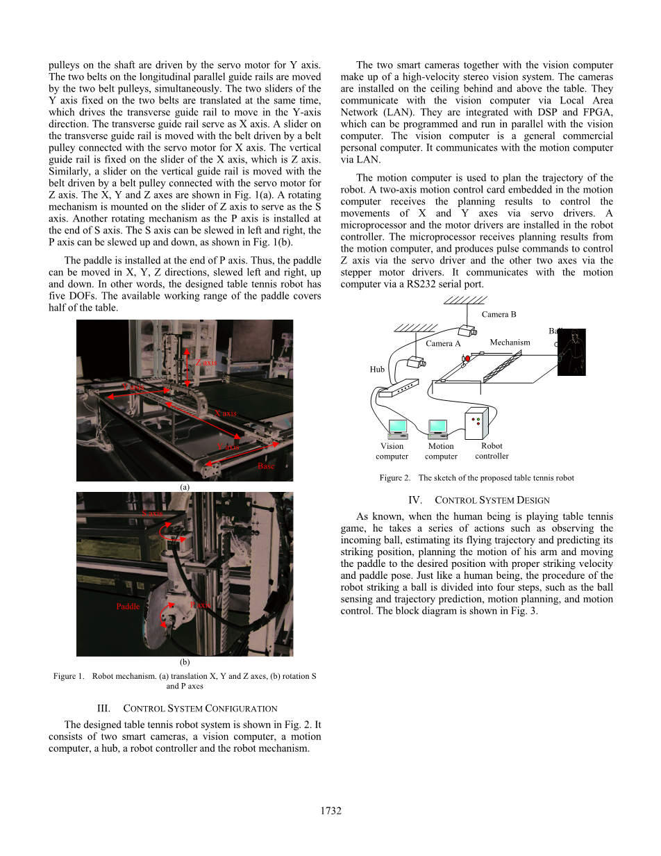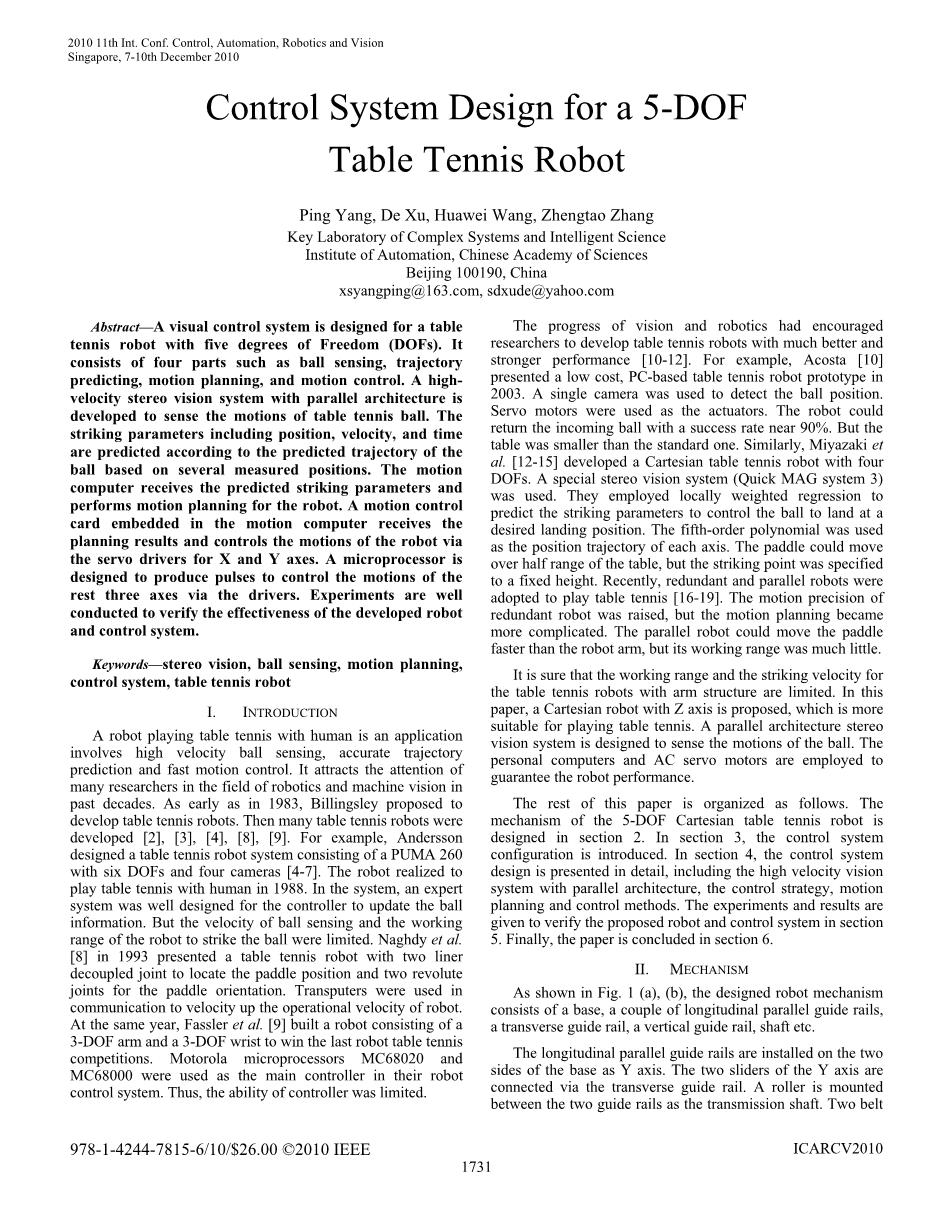 本文的其余部分组织如下,第二节讲述了设计五自由度笛卡尔式乒乓球机器人的机构;第3节介绍了控制系统的配置;第四节详细介绍了控制系统的设计,包括并行结构的高速视觉系统、控制策略、运动规划和控制方法;第五节给出了实验和实验结果,对所设计的机器人和控制系统进行了验证;第6节进行总结。