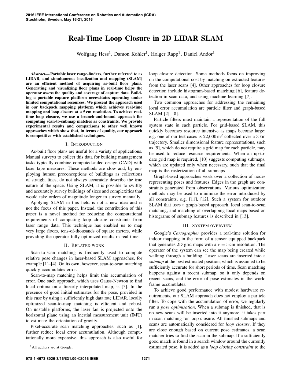 谷歌地图绘制者提供了一个实时的室内地图绘制解决方案,它是一个配备传感器的背包,可以生成分辨率为r=5厘米的二维网格地图。该系统的操作员可以在穿过建筑物时看到正在创建的地图。激光扫描被插入到一个最佳估计位置的子图中,这假设是足够准确的短期时间。扫描匹配产生在最近的子图上,因此它只依赖于最近的扫描,并且在整体帧中位置估计的误差会累积。