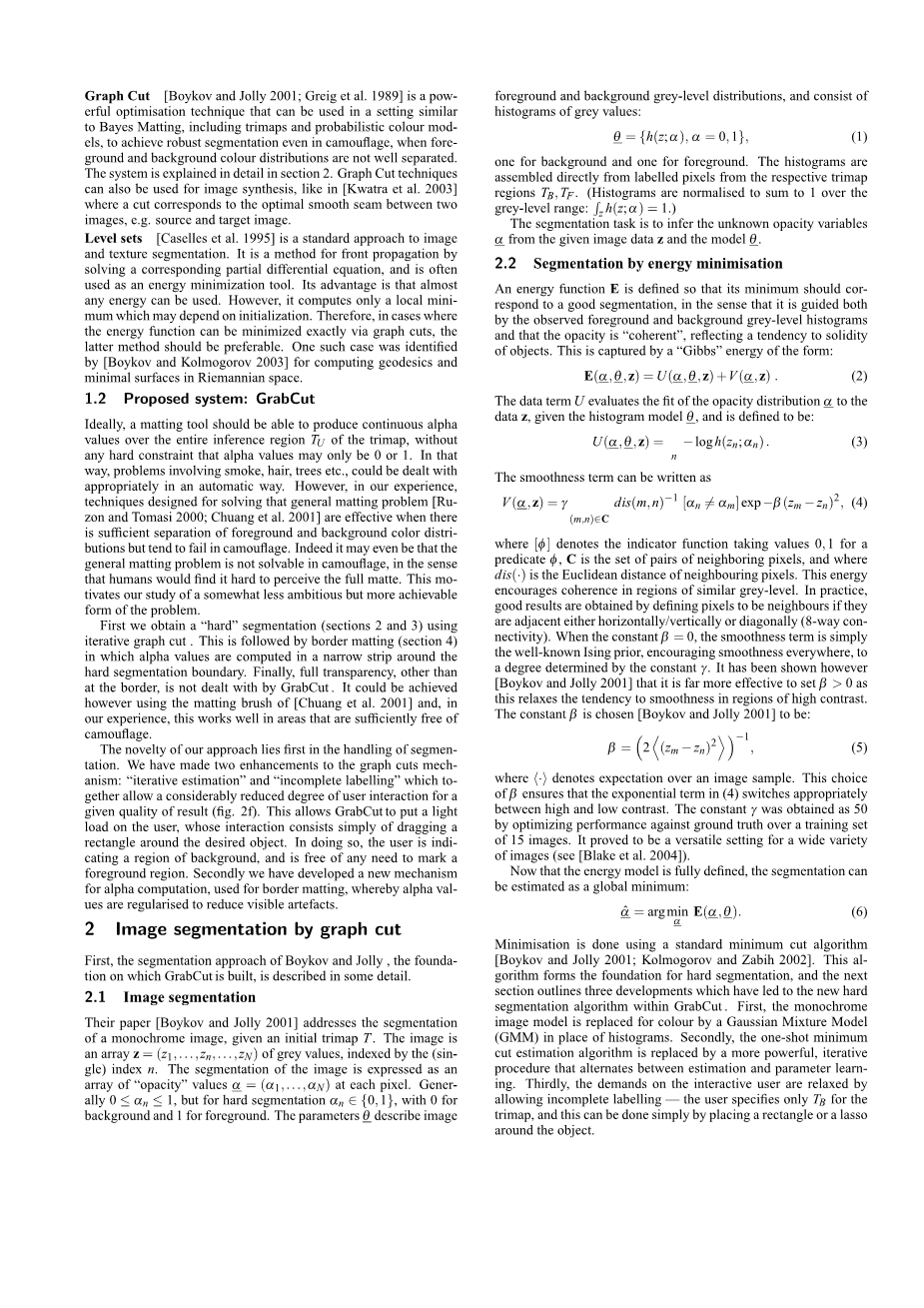 图切[Boykov和Jolly 2001;格雷格等人。1989]是一种强大的优化技术,可用于类似于贝叶斯遮罩的设置,包括三维图和概率颜色模型,即使在伪装中也能实现稳健的分割,前景色和背景色分布不均匀。该系统将在第2节中详细说明。图形切割技术也可用于图像合成,如[Kwatra et al]切割对应于两个图像之间的最佳平滑接缝,例如源图像和目标图像。