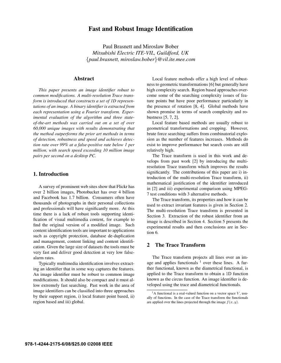 本文提出了一种对常见修饰具有鲁棒性的图像标识符。 引入了多分辨率Trace变换,构建了一组图像的一维表示。 使用傅立叶变换从每个表示中提取二进制标识符。 在一组超过60,000个独特图像上对该算法和三种最新方法进行了实验评估,结果表明该方法在检测时,鲁棒性和速度方面优于现有技术方法,并且实现了99%的假阳性率低于百万分之一的检测率,在台式PC上搜索速度超过每秒1000万个图像对。