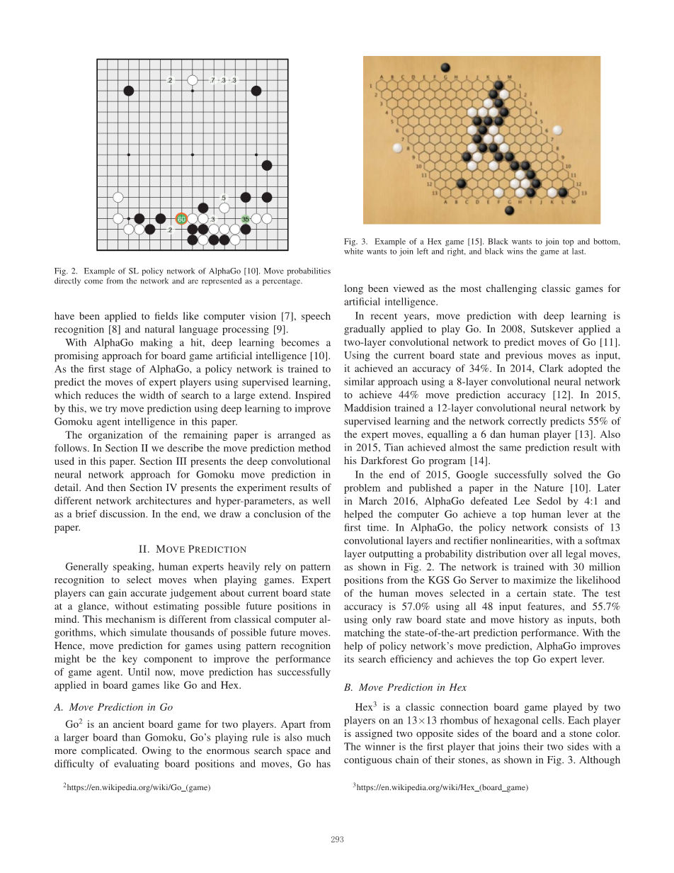 随着AlphaGo的成功,深度学习成为棋盘游戏人工智能的一种有前途的方法[10]。作为AlphaGo的第一阶段,策略网络经过培训,可以使用监督学习来预测专家级玩家的移动,从而大大缩短搜索范围。受此启发,我们尝试使用深度学习进行移动预测,以改善本文中的五子棋代理智能。