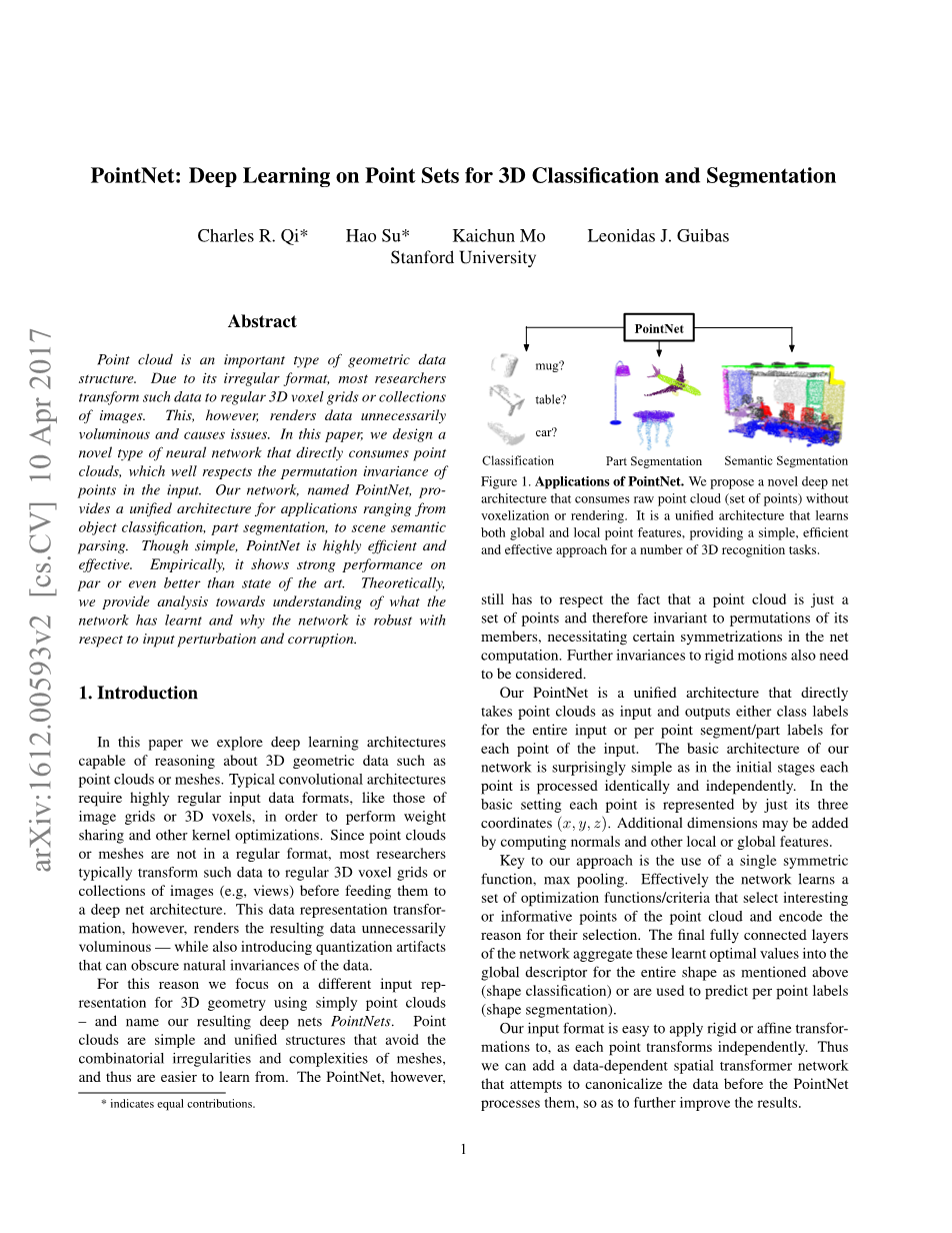 在这篇论文中,我们研究了能够对类似点云数据的三维几何数据结构进行推理的深度学习结构。典型的卷积神经网络需要高度规则的输入数据结构,例如那些图片的网格和三维的体素,来实现权重分享和其他的核优化。但是由于点云或者网孔不是规则的数据结构,大多数研究者在将数据输入神经网络之前,把这种不规则的数据结构转化为了规则的三维体素网格或者一系列二维图片(例如从不同视角)。但是这种数据结构形式的转换,需要不要的大量结果数据渲染,而这也带来的量化的人为因素会会干扰数据自有的不变性。