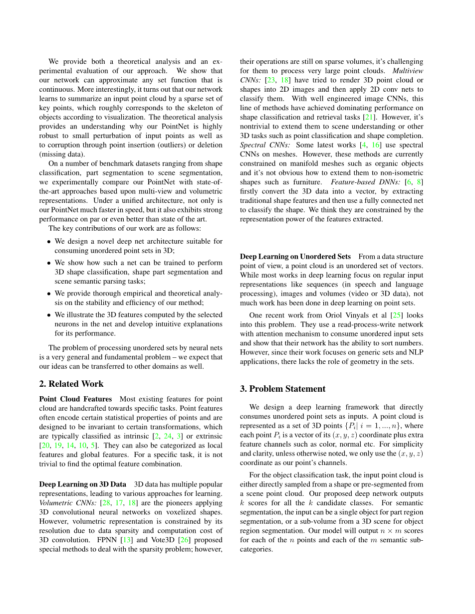 无序集上的深度学习 从数据结构的角度看,点云是一个无序的向量集合。在大多数工作集中于例如序列(在语言处理领域),图像和体积(视屏或三维数据)的规则的输入表示上时,在点集上的深度学习问题研究依然较少。