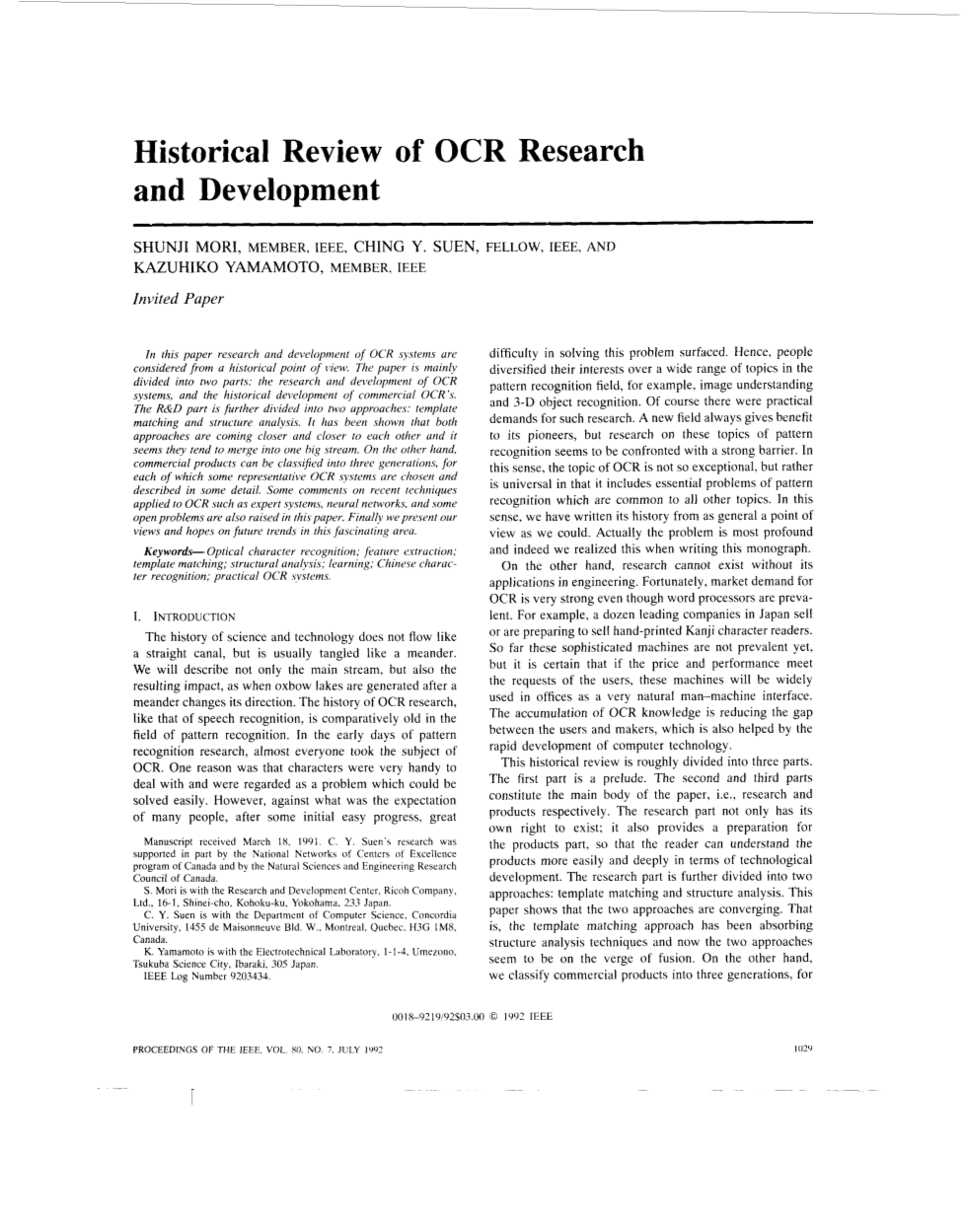 这一历史回顾大致分为三个部分。第一部分是前奏。第二和第三部分分别构成论文的主体,即研究和产品。研究部分不仅有自己的存在权;它还为产品部分提供了准备,使读者能够更容易,更深入地了解产品的技术发展。研究部分进一步分为两种方式:模板匹配和结构分析。本文表明这两种方法正在趋同。也就是说,模板匹配方法已经吸收了结构分析技术,现在这两种方法似乎处于融合的边缘。另一方面,我们将商业产品分为三代,我们选择代表性的OCR并对其进行详细描述。最后,我们对OCR的专家系统和神经网络应用进行了评论。