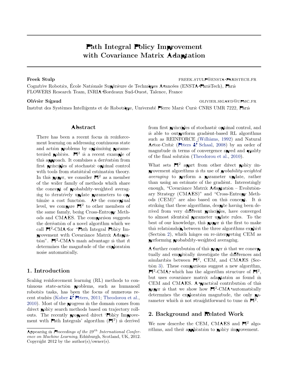 将强化学习(RL)方法扩展到连续的状态动作问题,例如人形机器人任务,一直是许多近期研究的焦点(Kober&Peters, 2011; Theodorou等人, 2010)。 该领域的大部分进展来自基于轨迹展示的直接政策搜索方法。 最近提出的直接#39;路径积分策略改进#39;算法(PI2)