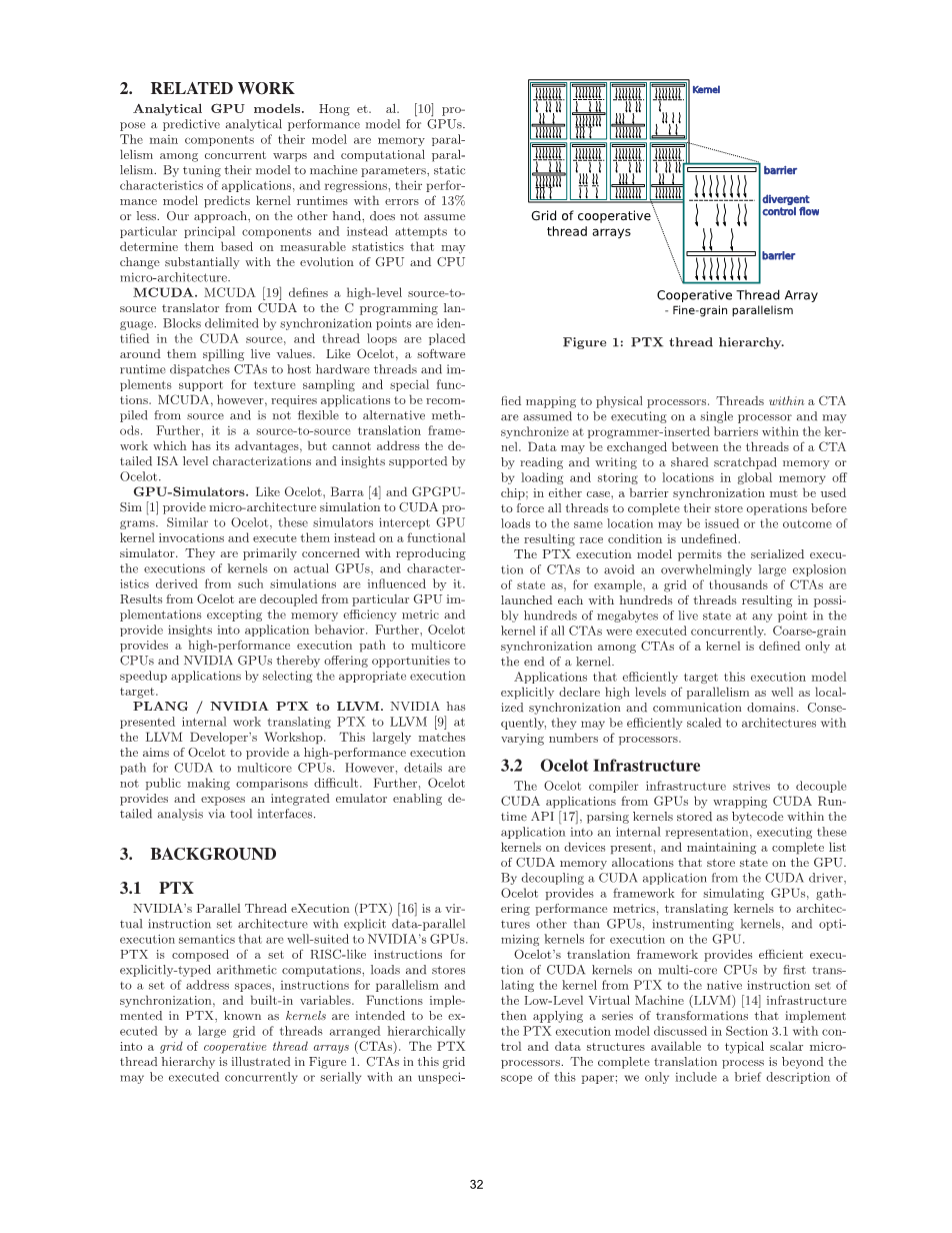 本文提供的分析和模型利用Ocelot框架来处理数据并行应用程序,并在异构平台上执行它们。 Ocelot框架[13]是一个模拟和编译基础结构,它实现了CUDA Runtime API,并且(1)模拟正在执行的内核,(2)将内核转换为CPU ISA,或者(3)将内核表示发送到CUDA驱动程序在连接的GPU上执行。 Ocelot独特地用于从未调整的CUDA应用程序中仿真内核收集指令和内存跟踪,分析控制和数据依赖性,以及在支持CUDA的GPU和多核CPU上高效地执行内核。 因此,除了支持详细和比较工作负载特性之外,基础架构还支持在CPU和NVIDIA GPU之间透明地移植PTX内核。