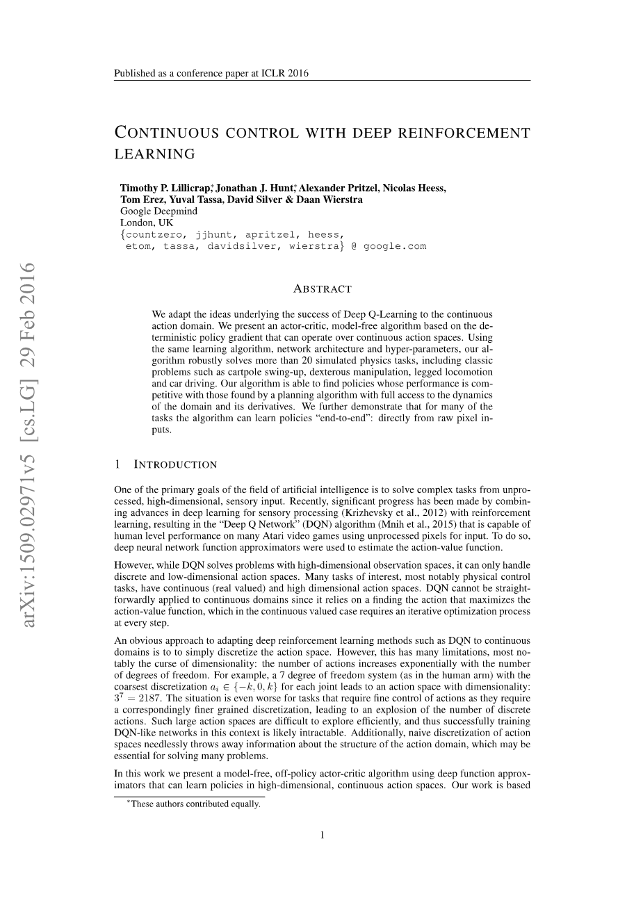 Timothy P. Lillicrap, Jonathan J. Hunt, Alexander Pritzel, NicolasHeess,Tom Erez, Yuval Tassa, David Silver amp; Daan Wierstra