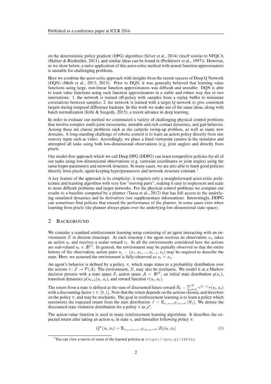 (DQN)(Mnih等,2013; 2015)。 在DQN之前,普遍认为使用大型非线性函数逼近器的学习值函数是困难和不稳定的。 DQN能够以稳定和强大的方式使用这些函数逼近器学习值函数,这归功于两项创新:1.网络通过来自重播缓冲区的样本进行关闭策略训练,以最小化样本之间的相关性; 2.网络接受目标Q网络的训练,在时间差异备份期间提供一致的目标。 在这项工作中,我们利用了同样的想法,以及批量标准化(Ioffe&Szegedy,2015),这是近期深度学习的进展。