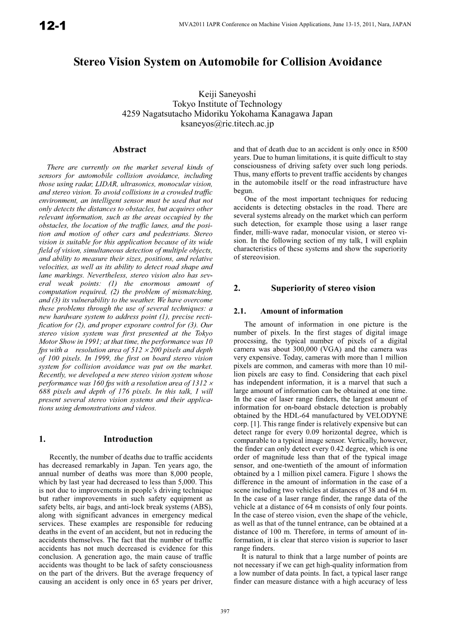 目前市场上有多种用于汽车避碰的传感器,包括那些使用雷达,LIDAR,超声波,单目视觉和双目视觉的传感器。 为了避免在拥挤的交通环境中发生碰撞,必须使用智能传感器,该传感器不仅可以检测到障碍物的距离,还可以获取其他相关信息,例如障碍物占用的区域,交通车道的位置以及位置其他车辆和行人的运动。 双目视觉适用于这种应用,因为其视野广阔,可同时检测多个物体,并能够测量其大小,位置和相对速度,以及检测道路形状和车道标记的能力。然而,双目视觉也有几个弱点:(1)需要大量的计算。(2)不匹配的问题。(3)易受天气影响。 我们通过使用多种技术克服了这些问题:一个新的硬件系统来解决(1),(2)的精确纠正和(3)的适当的曝光控制。 我们的双目视觉系统于1991年首次在东京车展上亮相。 那时的性能为10fps,分辨率为512times;200像素,深度为100像素。1999年,第一款用于避撞的双目视觉系统投放市场。最近,我们开发了一种新的双目视觉系统,其性能为160fps,分辨率为1312times;688像素,深度为176像素。在这篇论文中,我将通过推导和视频介绍几款双目视觉系统及其应用。