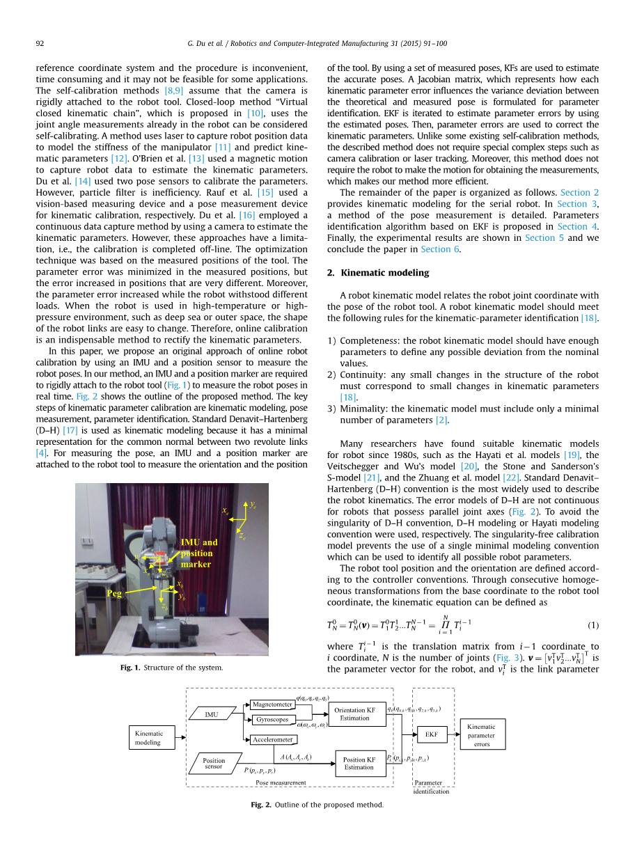 参考坐标系和程序不方便,耗时且对某些应用可能不可行。 自校准方法 [8,9] 假定相机刚性连接到机器人工具。 本文提出的闭环方法“虚拟闭合运动链” [10],使用已经在机器人中的关节角度测量值可以被认为是自校准的。 一种方法使用激光捕捉机器人位置数据来模拟机械手的刚度 [11] 并预测运动学参数 [12]。 O#39;Brien等人 [13] 使用磁场运动捕捉机器人数据来估计运动参数。 Du et al。 [14] 使用两个姿态传感器来校准参数。 但是,粒子过滤是无效的。 Rauf等人 [15] 分别使用基于视觉的测量装置和姿态测量装置进行运动学校准。 Du et al。 [16] 采用连续数据捕获方法,通过使用相机来估计运动参数。 但是,这些方法有一个局限性,即校准是离线完成的。 优化技术基于测量的工具位置。 测量位置的参数误差被最小化,但误差在非常不同的位置增加。 而且,机器人承受不同的负载时参数错误增加。 当机器人在深海或外太空等高温或高压环境中使用时,机器人连杆的形状很容易改变。 因此,在线校准是纠正运动参数不可缺少的方法。