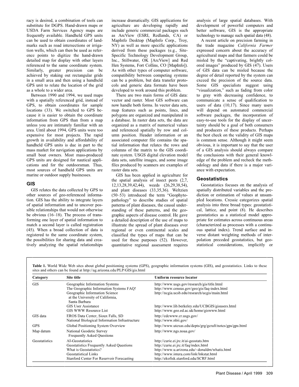GPS、GIS和地质统计的使用有利于不同水平的管理和鉴定。例如,手持GPS的顾问可将植物病害坐标信息传递给州立大学的专家,他可以利用GIS结合他的检验在一个更大的背景下评价该观测值。此技术有一个最有用的简单应用:存储和查询空间参考点数据。集成的好处在于将简单格式的数据和其他通过万维网来自于公共和个人的数据(道路、县界、数字高程模型、水文地理、土地所有边界、最重要的,其他农业数据)联系起来(表1)。在合适的情况下,点数据可通过地质统计插值产生表面图。