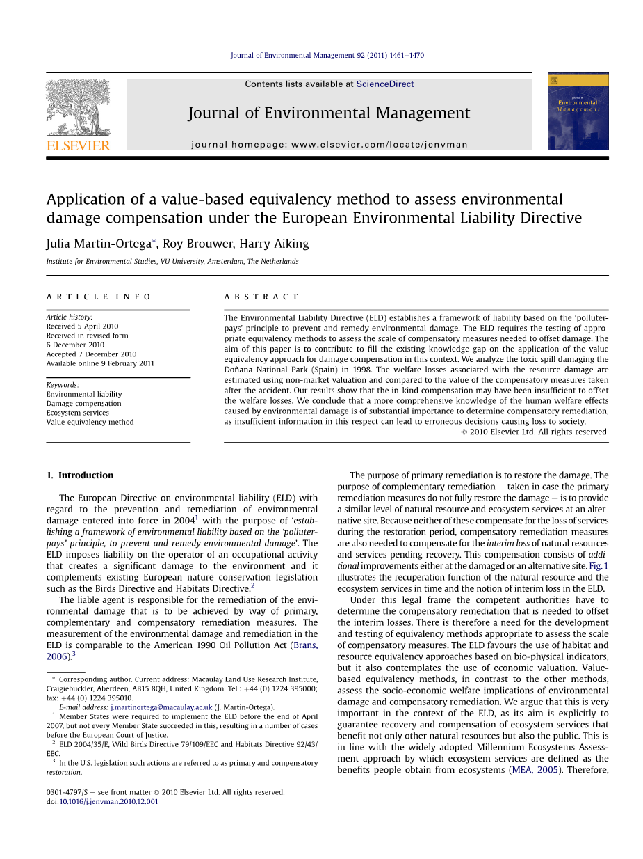 摘要 环境责任指令(ELD)建立了一个基于“污染者”原则的责任框架,以预防和补救环境损害。ELD要求测试适当的等效方法,以评估抵消损害所需的补偿措施的规模。本文的目的是为在这种背景下弥补损害赔偿价值等值方法应用中的现有知识差距做出贡献。我们分析了1998年对Dontilde;ana国家公园(西班牙)造成的有害物质泄漏的损害。与资源损失相关的福利损失是使用非市场估值估算的,并与事故后采取的补偿措施的价值进行了比较。我们的结果显示,实物补偿可能不足以抵消福利损失。我们的结论是,对环境损害造成的人类福利影响的更全面的了解对于确定补偿性补救具有重要意义,因为这方面的信息不足会导致错误的决定,从而造成社会损失。