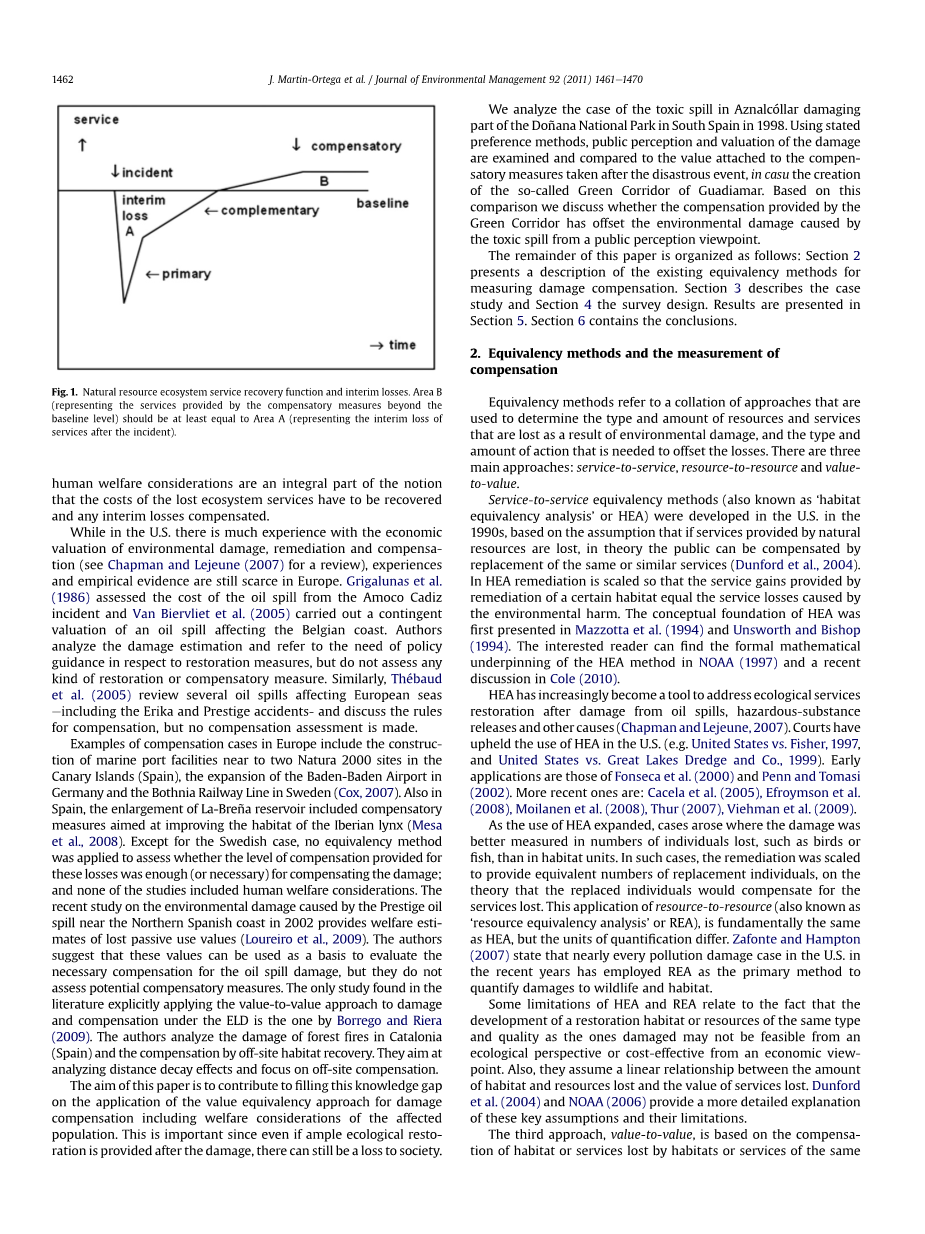 欧洲赔偿案例包括在加那利群岛(西班牙)的两个Natura 2000遗址附近建造海港设施,扩建德国的巴登 - 巴登机场和瑞典的Bothnia铁路线(COX,2007年)。同样在西班牙,La-Brentilde;a水库的扩大包括旨在改善伊比利亚ly in栖息地的补偿措施(Mesa 等,2008)。除瑞典案例外,没有采用等效方法来评估为这些损失提供的赔偿水平是否足以(或必要)补偿损害;没有一项研究包括人类福利方面的考虑。最近关于2002年西班牙北部海岸附近的Prestige石油泄漏造成的环境破坏的研究提供了失去被动使用价值的福利估计(Loureiro等,2009)。作者提出,这些数值可以作为评估石油泄漏损害必要补偿的依据,但他们没有评估潜在的补偿措施。在文献中发现的唯一一项研究明确地将价值 - 价值方法应用于ELD下的损害和补偿是唯一的Borrego和Riera (2009)。作者分析了加泰罗尼亚(西班牙)森林火灾的破坏情况以及异地栖息地恢复造成的补偿。他们的目标是分析距离衰减效应,并专注于场外补偿。