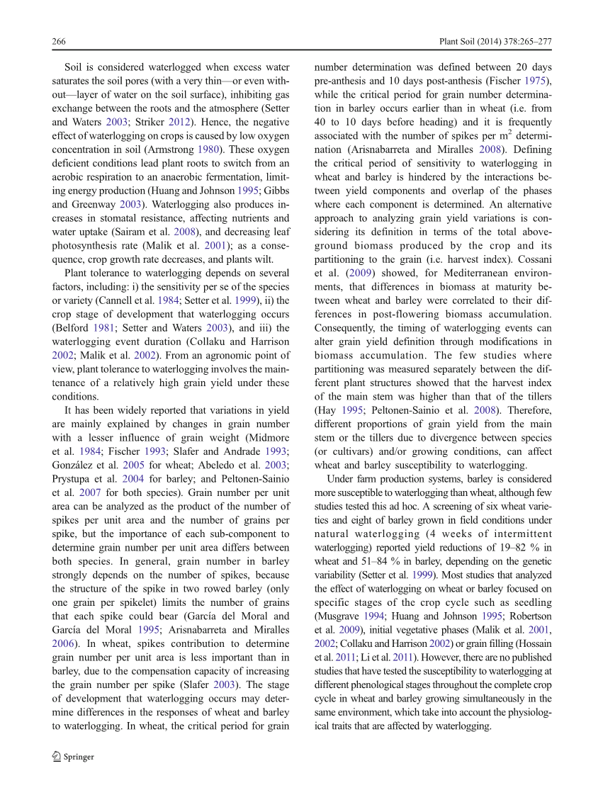 在农业生产系统中,大麦被认为比小麦更容易受涝,尽管很少有研究对此进行专门的测试。经过筛选,6个小麦品种和8个大麦品种在自然涝渍条件下(4周间歇性渍水),小麦产量下降19~82%,大麦产量下降51~84%,这取决于遗传变异性(Setter et al. 1999)。大部分研究分析了渍水对小麦或大麦的影响,其集中在作物周期的特定阶段,如幼苗(Musgrave 1994; Huang and Johnson 1995; Robertson et al. 2009),初始营养期(Malik et al. 2001, 2002; Collaku and Harrison 2002)或籽粒灌浆(Hossain et al. 2011; Li et al. 2011)。然而,目前还没有已发表的研究报告。 考虑到小麦和大麦在同一环境中同时生长的整个作物周期,在不同的物候阶段易受水淹的影响和受涝影响的生理特征。本研究的目的是分析在小麦和大麦全生育期中不同生育期的涝渍对小麦和大麦产量及其构成因素的影响。以及这两个物种中最敏感的时期。