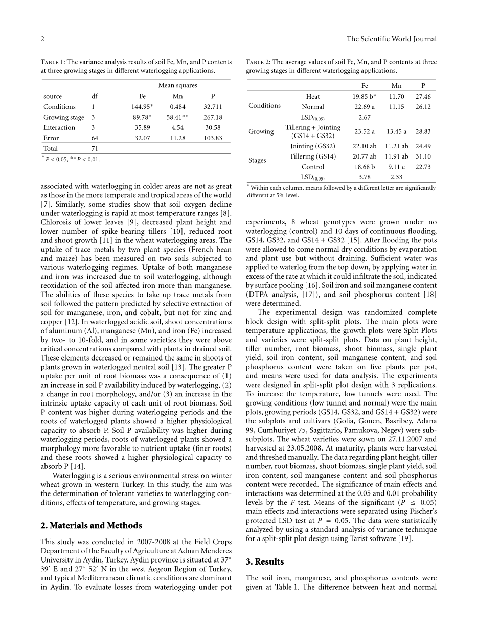 在实验中不同品种的小麦对于涝害表现出了不同的反应。涝渍对品种的显着负效应在高温分蘖和拔节期(GS14 GS32)。分蘖期和拔节期淹水将使得土壤铁锰含量显着增加。因此建议将Basribey和Sagittario小麦品种作为耐涝品种。这项研究将为小麦种植者在未来发挥重要作用,以实验中不同品种的小麦对于涝害表现出的不同反应为参考,从而在遇到涝灾时能做出更好的作物管理决策。