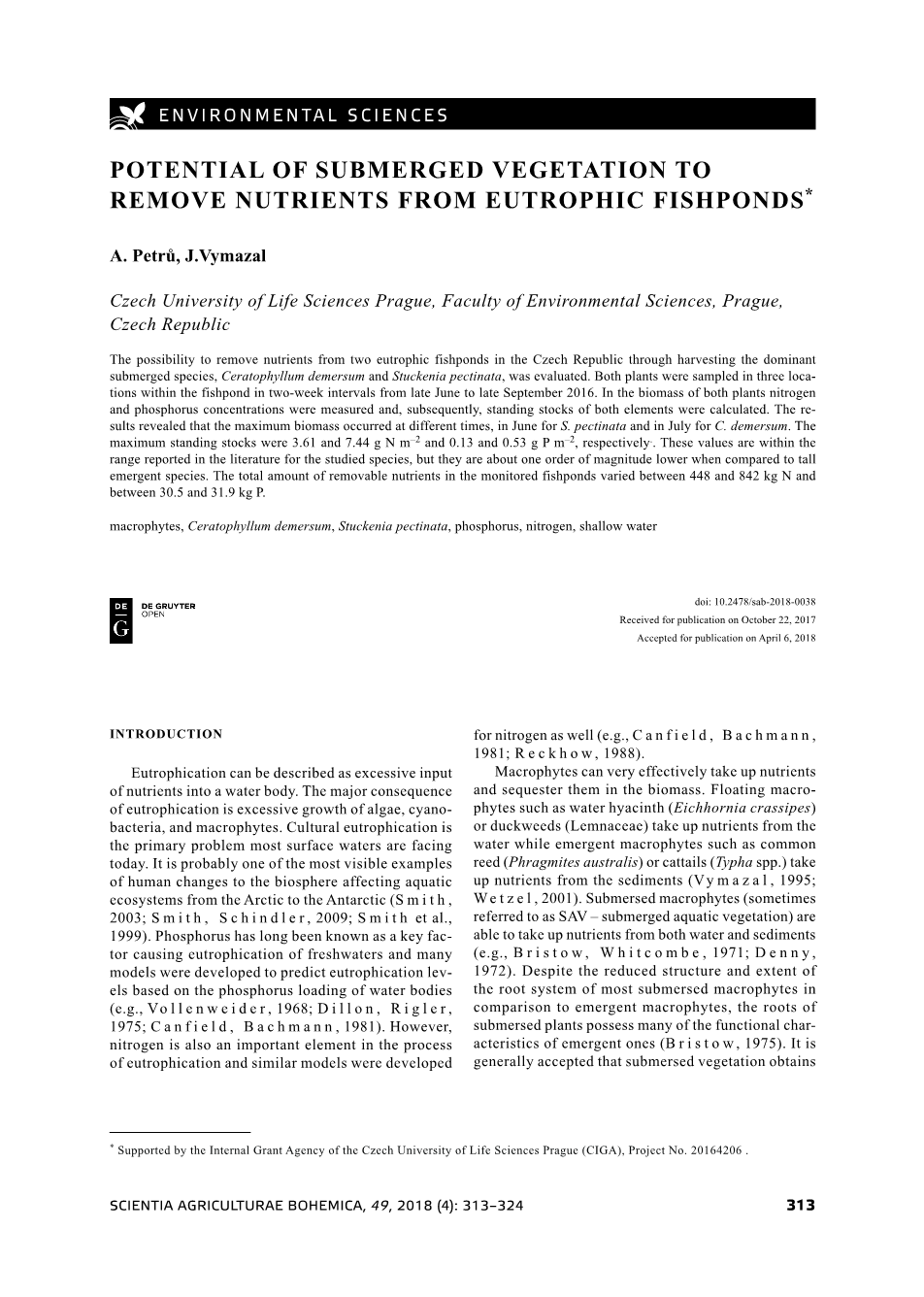 MalyDubovec鱼塘是一个历史悠久的鱼塘,目前用于鲤鱼鱼苗生产。这个鱼塘是一个小型保护区的一部分,没有密集的生产区。从历史上看,1948年该地区的植物主要为Potamogetonetonatantis-NymphaeetumcandidaeHejny(Hejny,Husak,1978)。在20世纪70年代,该池塘主要为1933年的Elodeetum canadensis Eggler群落所占据,以 Elodea canadensis Michx为主。(Pokornyetal.,1984)。目前,池塘有一个发达的沿海带,典型的沉水植物以初夏密集的蓖齿眼子菜林分为代表。在本季节后期,植物的特点是大茨藻,金鱼藻,穗状狐尾藻穗状狐尾藻,以及靠近海岸线的竹叶眼子菜。鱼塘的平均深度为1.5米,总面积仅为8.8公顷;它被归类为小型鱼塘。底部主要由砾石砂部分形成,覆盖了一层分解有机材料层。鱼塘被来自上游大型受保护鱼塘区的富营养化水饱和。在野外实验期间,鱼塘保持了相当好的水透明度水平,鱼群没有引起系统的任何重大变化。在Stuckenia pectinate生长季节结束时,水体底部记录到有规律地氧缺乏记录。