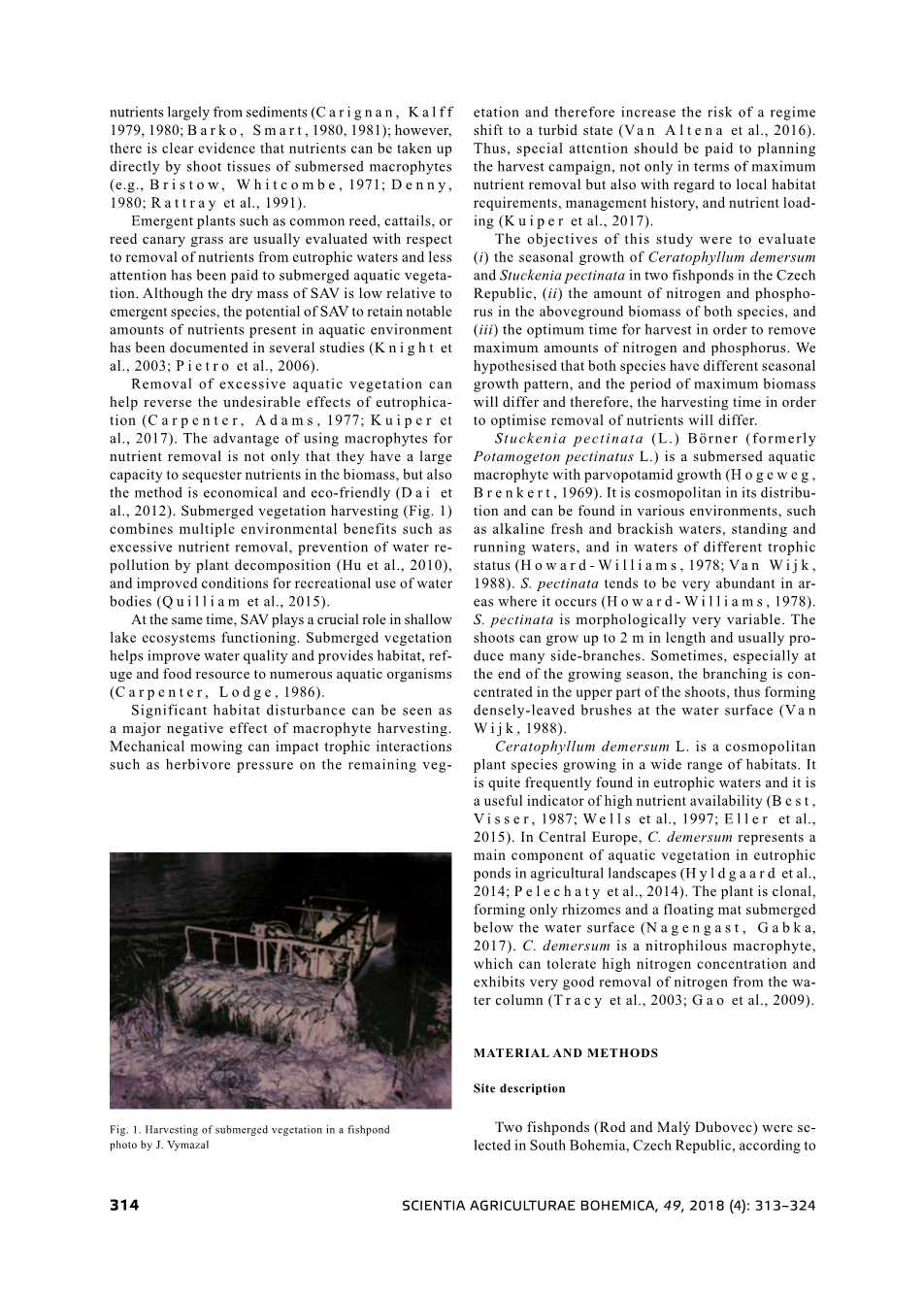 根据历史上充分记录的物种即蓖齿眼子菜和金鱼藻,在捷克共和国南波西米亚选择了两个鱼塘(Rod和Malyacute;Dubovec)。