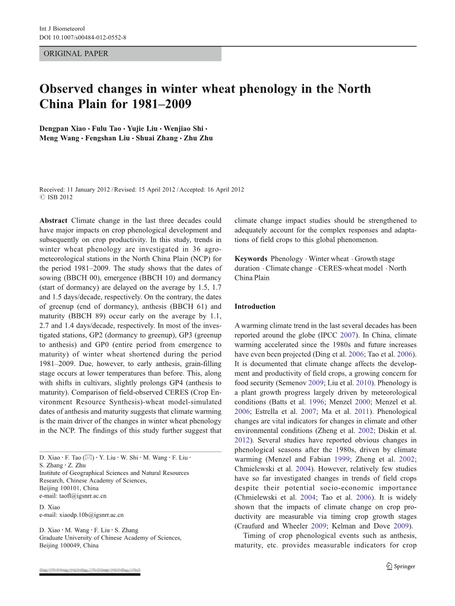 摘要:过去三十年的气候变化可能对作物物候发展和作物生产力有重大影响。在本研究中,调查了华北平原1981-2009年冬小麦物候的趋势。研究表明:播种期(BBCH 00)、出苗期(BBCH 10)、休眠期(休眠开始)平均延迟1.5天、1.7天和1.5天/十年。与之相反,绿化(休眠结束)、开花期(BBCH 61)和成熟期(BBCH 89)平均提前 1.1天、2.7天和1.4天/十年。在大多数调查站中,冬小麦的GP2(休眠到绿化)、GP3(绿化到开花期)和GP0(出苗到成熟期)在1981-2009年期间缩短。然而,由于早期开花,灌浆期出现在比以前更低的温度。这一点,稍微延长了GP4(开花期到成熟期)。田间观察CERES-小麦模型-开花和成熟时间模型表明,气候变化是冬小麦物候变化的主要因素。这项研究的结果表明应当加强气候变化的研究,以应对田间作物对此全球变化的复杂反应和适应。