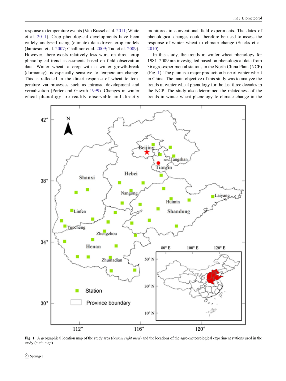 过去几十年来,全球各地都报道了气候变暖的趋势(IPCC,2007年)。在中国,自上世纪80年代以来,气候变暖加速,甚至预测了未来的增长 (丁等人2006年;陶等人2006年)。据记载,气候变化影响田间作物的发育和生产力,这是对粮食安全的日益关注(Semenov 2009年;Liu等人2010年)。 植物生长主要受气象条件的影响(Batts等1996年;Menzel等2000年;Menzel等 2006年;Estrella等 2007年;Ma等人2011年)。物候变化是气候和其他环境条件变化的重要指标(郑等人2002年;Diskin等 2012年)。有研究报告表明,1980年以后,受到气候变暖的驱动,物候季节发生了明显的变化(Menzel and Fabin 1999年和郑等人2002年;Chmielewski等 2004年)。然而,到目前为止,对田间作物动态变化的研究相对较少,尽管它们具有潜力的经济重要性(Chmielewski等 2004;陶等人 2006)。(2006年)。人们普遍认为,气候变化对作物生产力的影响是通过作物生育期来衡量的(Craufurd and Wheeler 2009; Kelman and Dove 2009 )。