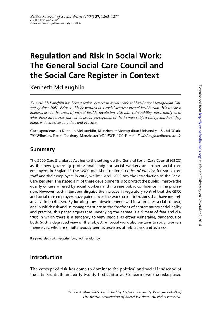本文考察了社会工作如何与英国社会当代的风险相关,主要侧重于英国社会保障部(GSCC)的职权范围。首先讨论了目前的风险预占及其管理,以及如何影响社会工作。第二,在这样的背景下,推动社会照料人员的监管和登记也是要考虑的,重点关注“2000年照顾标准法案”(CSA)的要求和含义,特别是GSCC的成立和社会护理登记册的介绍。第三,有这样的争论说CSA的实施和周围的争议增加了国家和雇主对员工生活的监管,这代表着社会工作者,他们的客户和更广泛社会的退化观念。