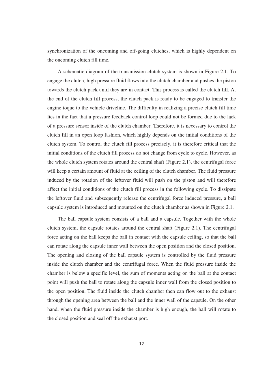 传动离合器系统原理图如图2.1所示。为了与离合器接合,高压流体流入离合器腔内,将活塞推向离合器组,直到它们接触。这个过程叫做离合器充填。在离合器充装过程结束时,离合器组已准备好被接合以将发动机托架转移到车辆传动系。由于离合器腔内缺少压力传感器,无法形成压力反馈控制回路,是实现精确离合器充液时间的难点。因此,有必要以开环方式控制离合器的充气,这在很大程度上取决于离合器系统的初始条件。因此,为了精确控制离合器充填过程,关键是离合器充填过程的初始条件不随循环而改变。但是,当整个离合器系统围绕中心轴旋转时(图2.1),离心力会在离合器腔的顶部保持一定的流体。剩余流体的旋转所产生的流体压力会对活塞产生推力,从而影响下一个循环离合器充注过程的初始条件。为了消除剩余流体,释放离心力诱导的压力,引入球囊系统,安装在离合器腔上,如图2.1所示。