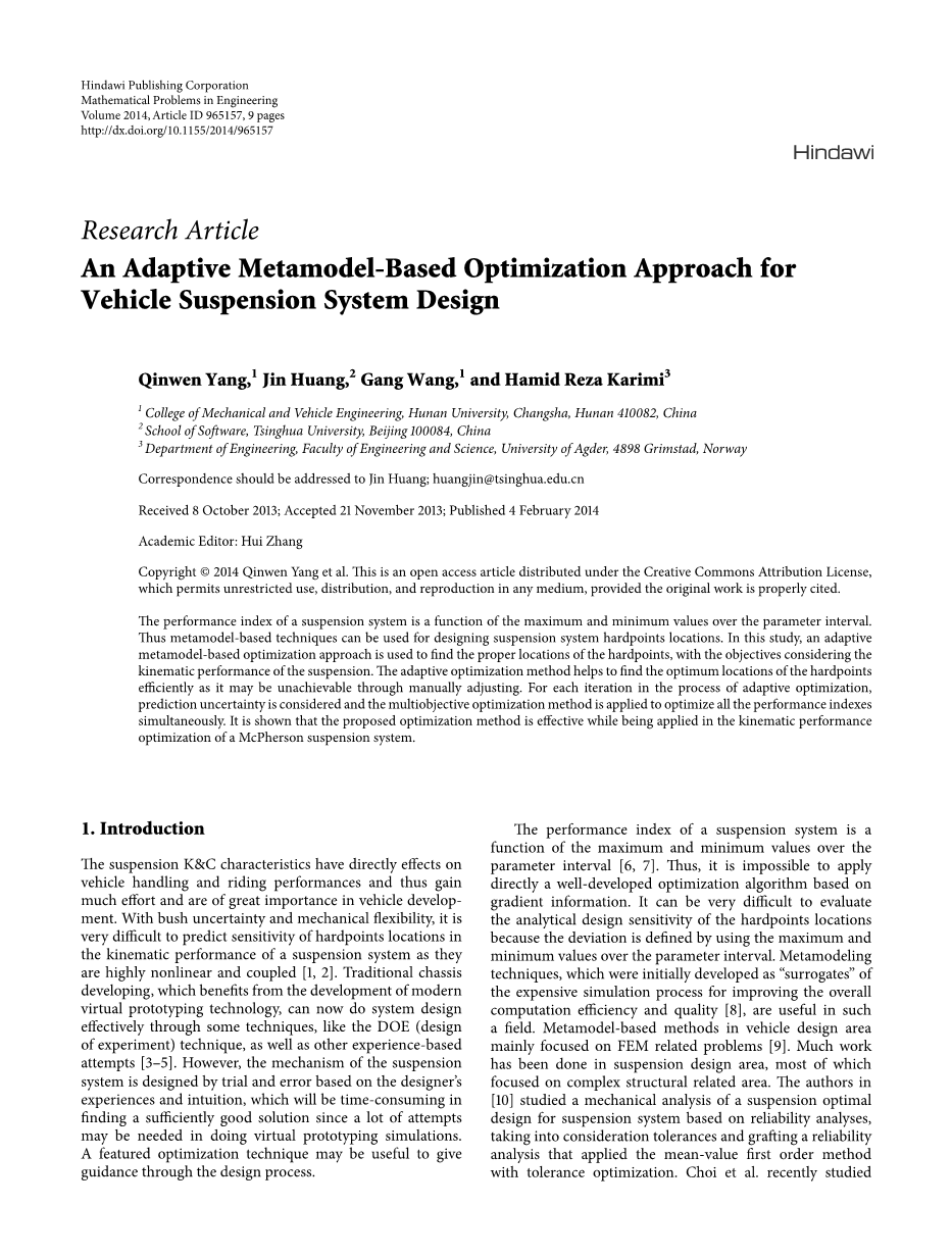 悬架系统的性能指标是参数区间内最大值和最小值的函数[6,7]。因此,不可能直接应用一种基于梯度信息的优化算法。由于偏差是通过使用参数区间内的最大值和最小值来定义的,因此很难评估硬点位置的分析设计灵敏度。元建模技术最初作为昂贵的模拟过程的“替代物”开发,用于提高整体计算效率和质量[8],在这一领域非常有用。基于元模型的车辆设计方法主要集中在有限元相关问题上[9]。悬索设计领域做了大量的工作,主要集中在复杂的结构相关领域。[10]中的作者研究了基于可靠性分析的悬架系统优化设计的力学分析,考虑了公差,并将平均值一阶法与公差优化结合起来进行了可靠性分析。崔等最近研究了基于可靠性分析的汽车悬架系统优化设计,以提高系统的运动学和柔度特性;以确定性优化的结果为初始值,采用单回路单变量法进行了可靠性优化。通过对15个设计变量和4个随机常数进行1700次分析,解决了鲁棒设计问题[11]。近年来,基于元模型的优化技术在汽车悬架系统Kamp;C性能设计中的应用研究取得了较好的效果。康等介绍了一种基于序贯逼近优化技术的鲁棒悬架系统设计方法,该方法考虑了衬套柔度不确定性对系统运动特性的影响。鲁棒设计问题有18个设计变量和18个具有不确定性的随机常数[12]。随后,该团队提出了一种所谓的目标级联方法,用于悬架系统的鲁棒设计优化过程,以提高车辆的动态性能[13]。该系统的设计目标从车辆级级联到悬架系统级。将悬架系统的设计问题结构定义为一个层次化的多级设计优化,利用基于元模型的鲁棒设计优化技术,解决了各层次的设计问题。以上研究为采用基于元模型的技术进行悬架系统优化开辟了一条新的途径,并对其进行了有效性测试,从而推动了我们今后的研究方向。然而,以往的研究既没有考虑同时优化多个目标,使其在可比区间内保持稳定,也没有对每个设计参数在加速目标参数收敛方面给出搜索指导。