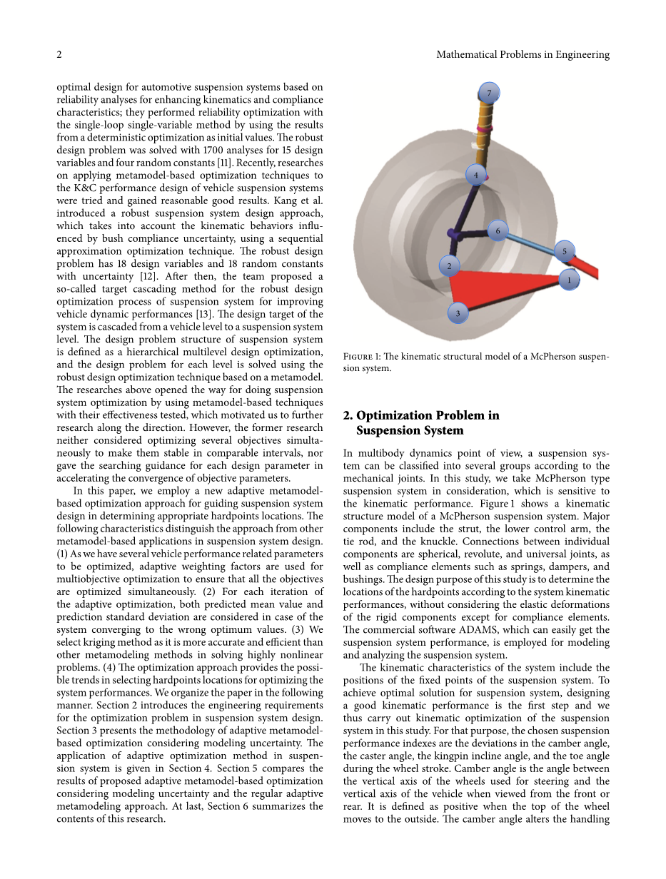 由于我们有几个与车辆性能相关的参数需要优化,因此采用自适应加权因子进行多目标优化,以确保所有目标同时优化。(2)对于自适应优化的每次迭代,当系统收敛到错误的最优值时,均考虑预测均值和预测标准差。(3)我们选择克里格方法,因为它比其他元建模方法更精确和有效地解决高度非线性问题。(4)优化方法提供了选择硬点位置以优化系统性能的可能趋势。我们按照以下方式组织论文。第二节介绍了悬架系统设计中优化问题的工程要求。第三部分介绍了考虑模型不确定性的自适应元模型优化方法。第四节介绍了自适应优化方法在悬架系统中的应用。第五节比较了考虑建模不确定性的自适应元模型优化方法和常规自适应元模型方法的结果。最后,第6节总结了本研究的内容。