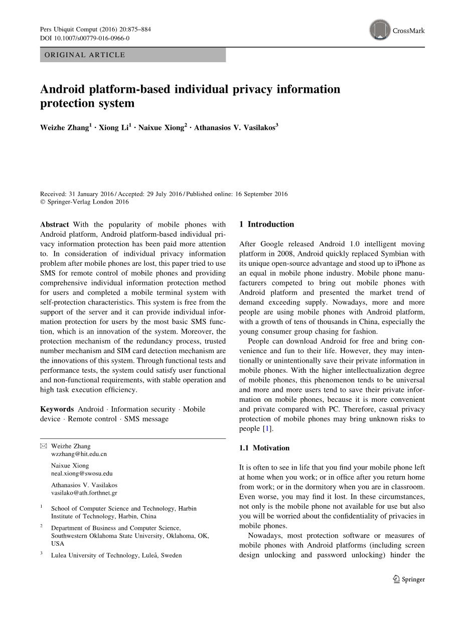 随着Android系统手机的流行,基于Android平台的个人隐私保护受到越来越多的关注。考虑到手机丢失导致的个人隐私问题,本论文尝试使用SMS远程控制手机,并且为用户提供全方位的隐私保护措施,最终完成了具有自我保护功能的移动终端系统。本系统不需要服务器的支持,它利用最基本的SMS功能为用户提供个人信息保护,这也是本系统的创新所在。并且,本系统的创新还有冗余处理保护机制,受信任的号码机制和SIM卡追踪机制。通过功能测试和操作测试,本系统有稳定的操作和高效的任务处理能力,可满足用户的功能性和非功能性要求。