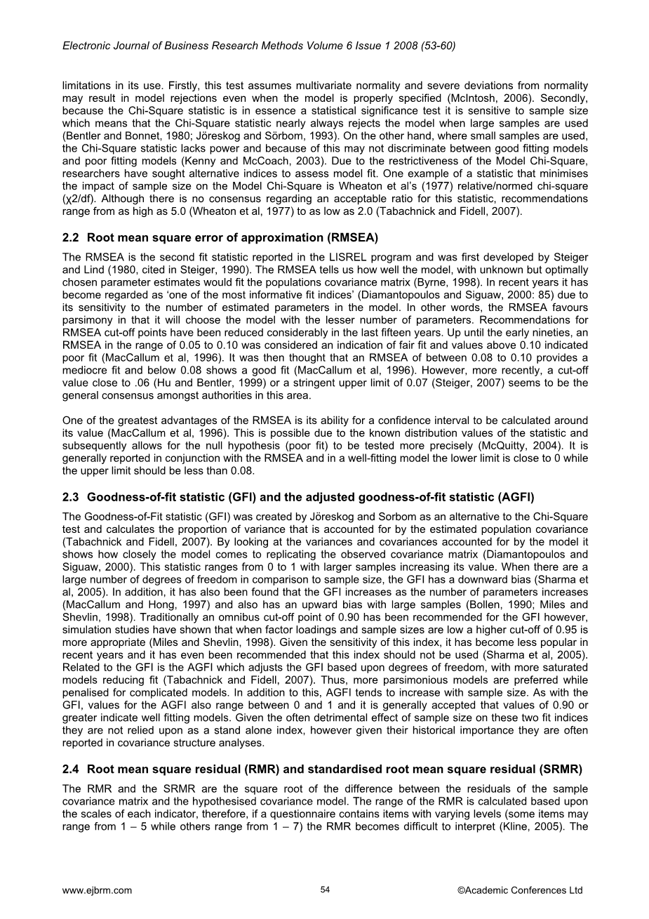 RMSEA是在LISREL程序中报告的第二个拟合的统计数据,最初是由斯泰格尔和林德(1980,在Sigige,1990)中引用的。RMSEA告诉我们,模型如何,未知但最佳选择的参数估计将适合群体协方差矩阵(拜恩,1998)。近年来,由于其对模型中估计参数的敏感性,已被认为是“最具信息性的拟合指数”(DIAMANDOPOULOS和SIGUAW,2000:85)。换言之,RMSEA倾向于吝啬,因为它将选择具有较少数量的参数的模型。在过去的十五年里,RMSEA截止点的建议大大减少了。直到90年代初,RMSEA在0.05至0.10的范围内被认为是一个合适的适应度和价值超过0.10表示差拟合(McCalLUM等,1996)。当时认为,0.08到0.10之间的RMSEA提供了一个平庸的拟合,低于0.08显示出良好的匹配(McCalLUM等人,1996)。然而,最近,截止值接近06(Hu and Bentler,1999)或严格上限(0.07)(Sigige,2007)似乎是这一领域内权威的普遍共识。